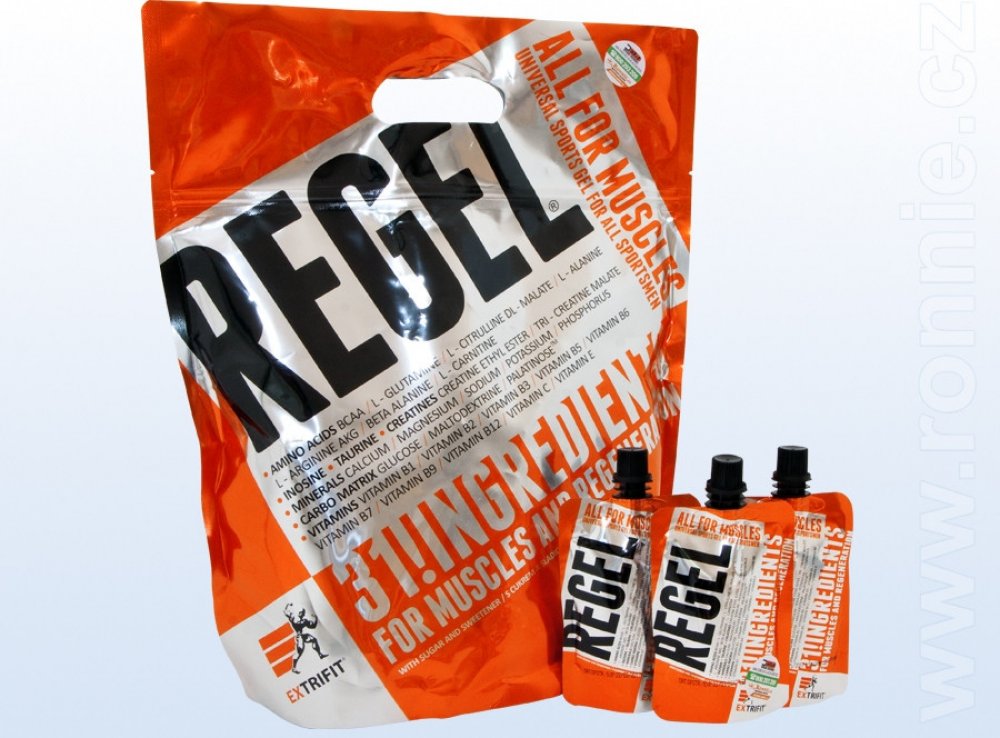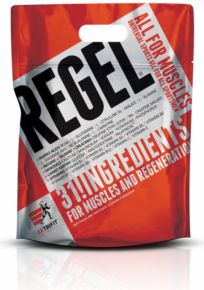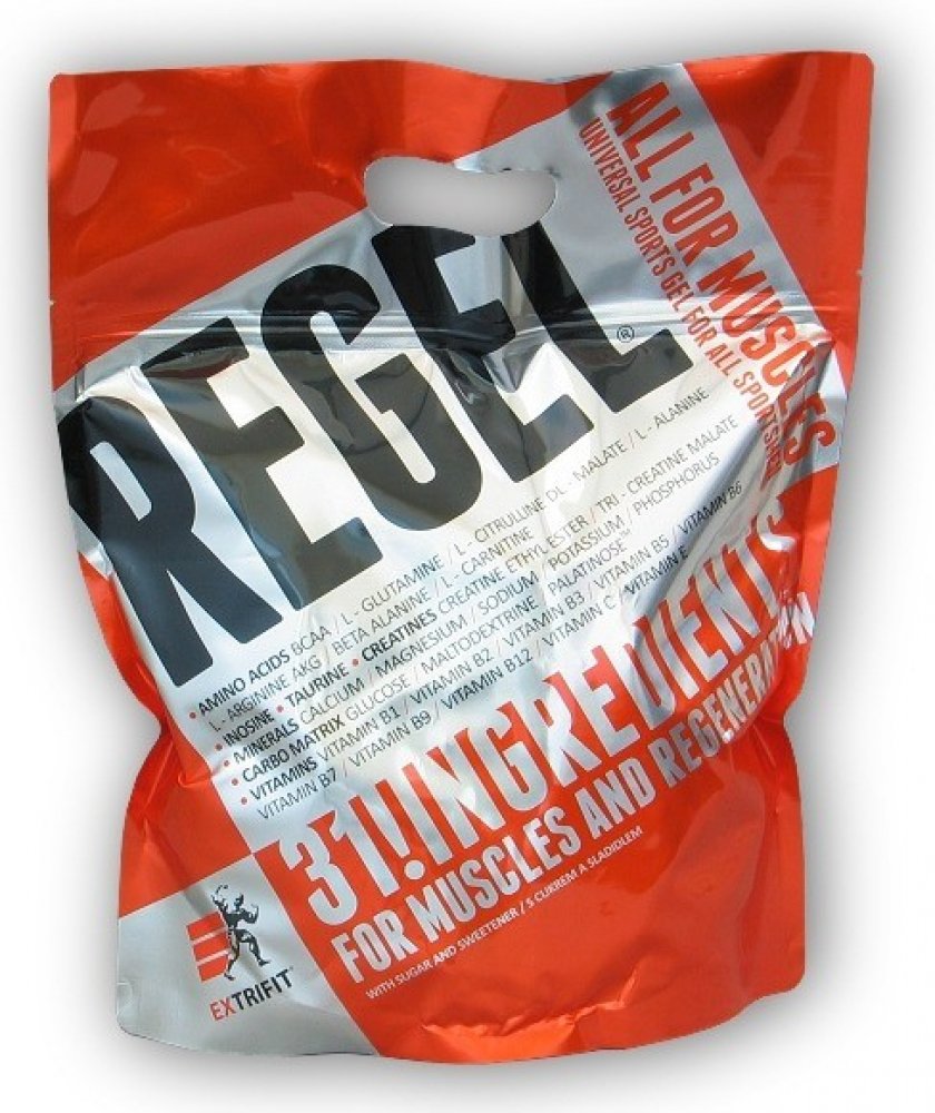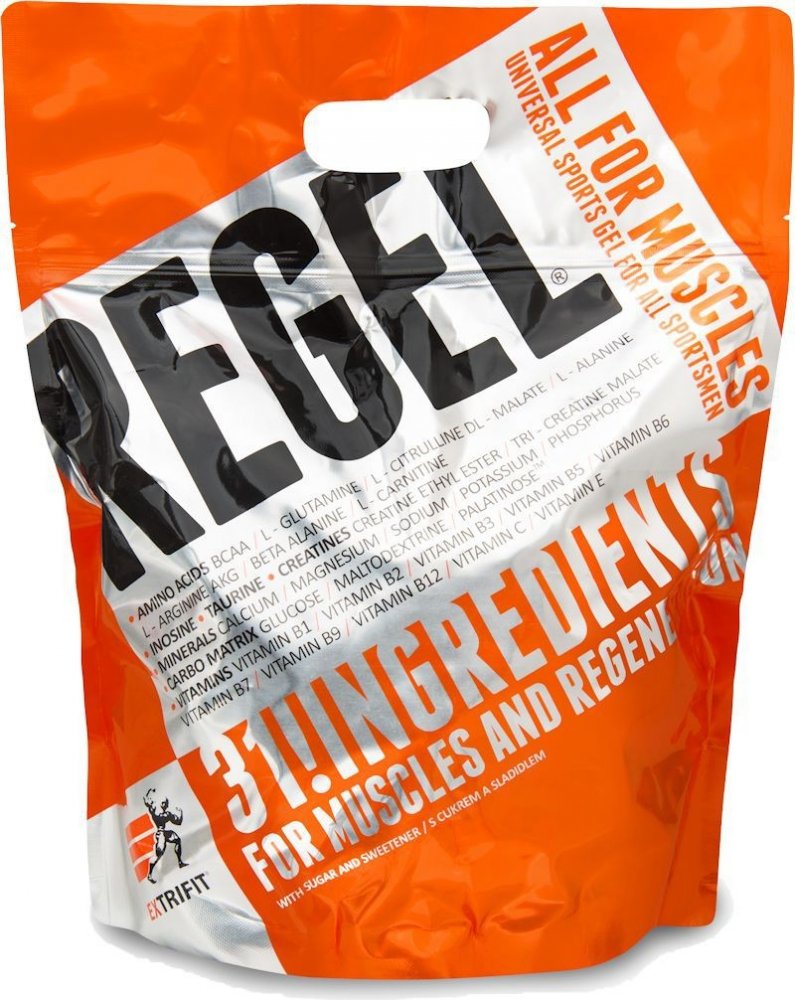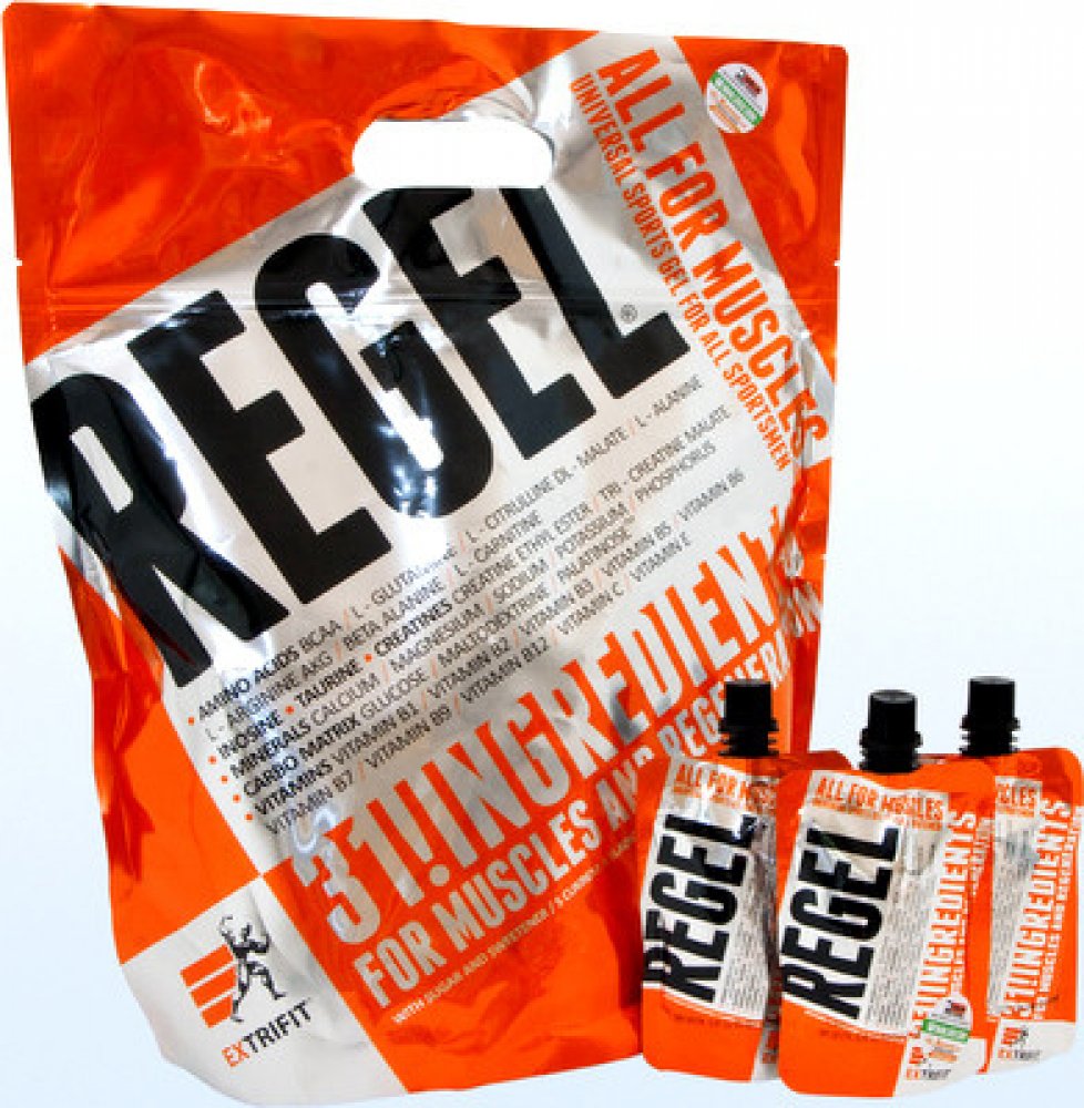 Lámali jste si někdy hlavu nad tím, jaké všechny látky a v jakém množství máte dávkovat pro urychlení regenerace po tréninku? Jaké přijímat sacharidy, jak dávkovat aminokyseliny nebo kolik užívat glutaminu a kreatinu pro odvrácení katabolismu po tréninku? Firma Extrifit vyslyšela tyto Vaše časté dotazy! Regel® je dokonale sestaveným komplexem všech látek, které sportovec nutně potřebuje doplnit v průběhu a po skončení tréninku! Regel® obsahuje pečlivě vyvážený poměr tří druhů sacharidů a volných aminokyselin, anabolizéry, dvě formy kreatinu a komplex vitamínů a minerálních látek. A to vše ve formě hotového gelu připraveného k okamžité konzumaci.