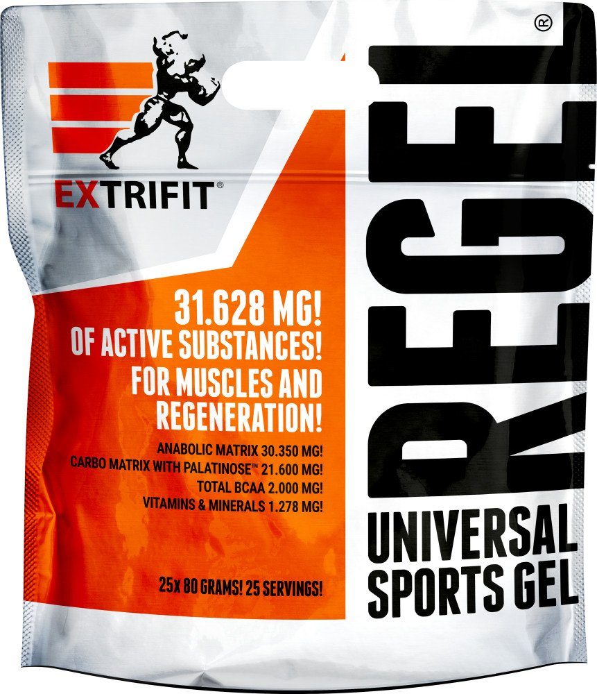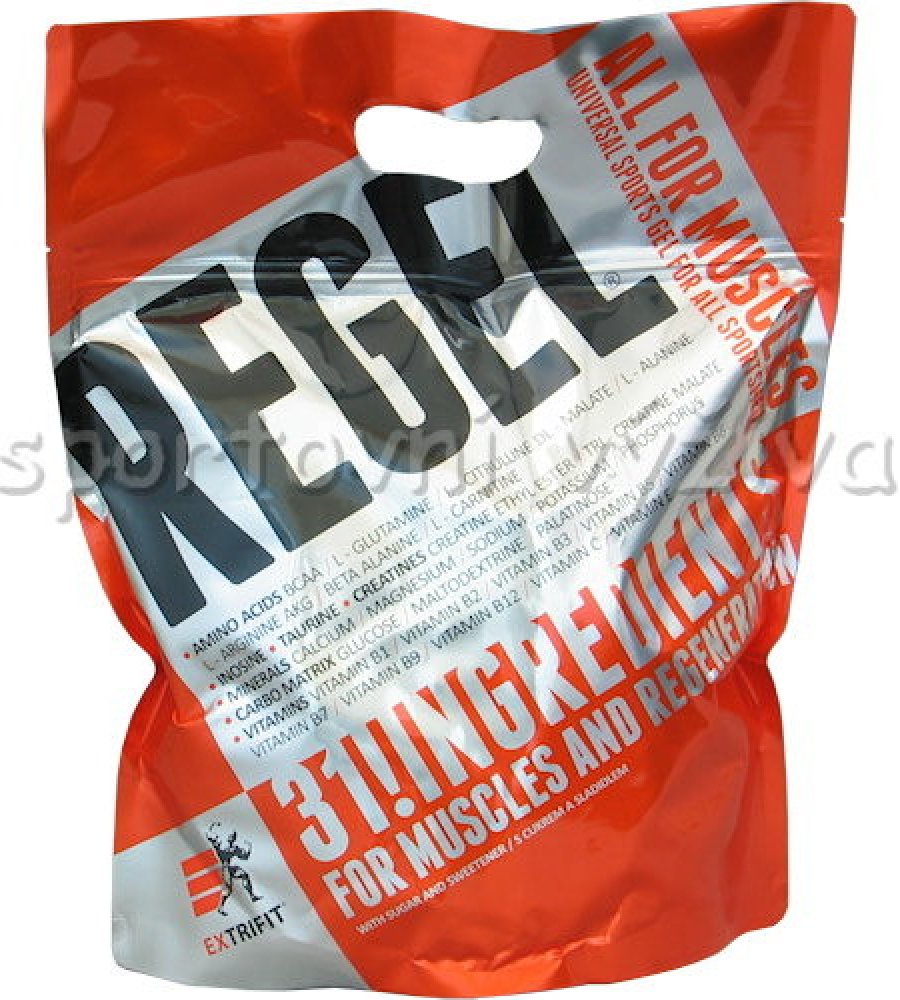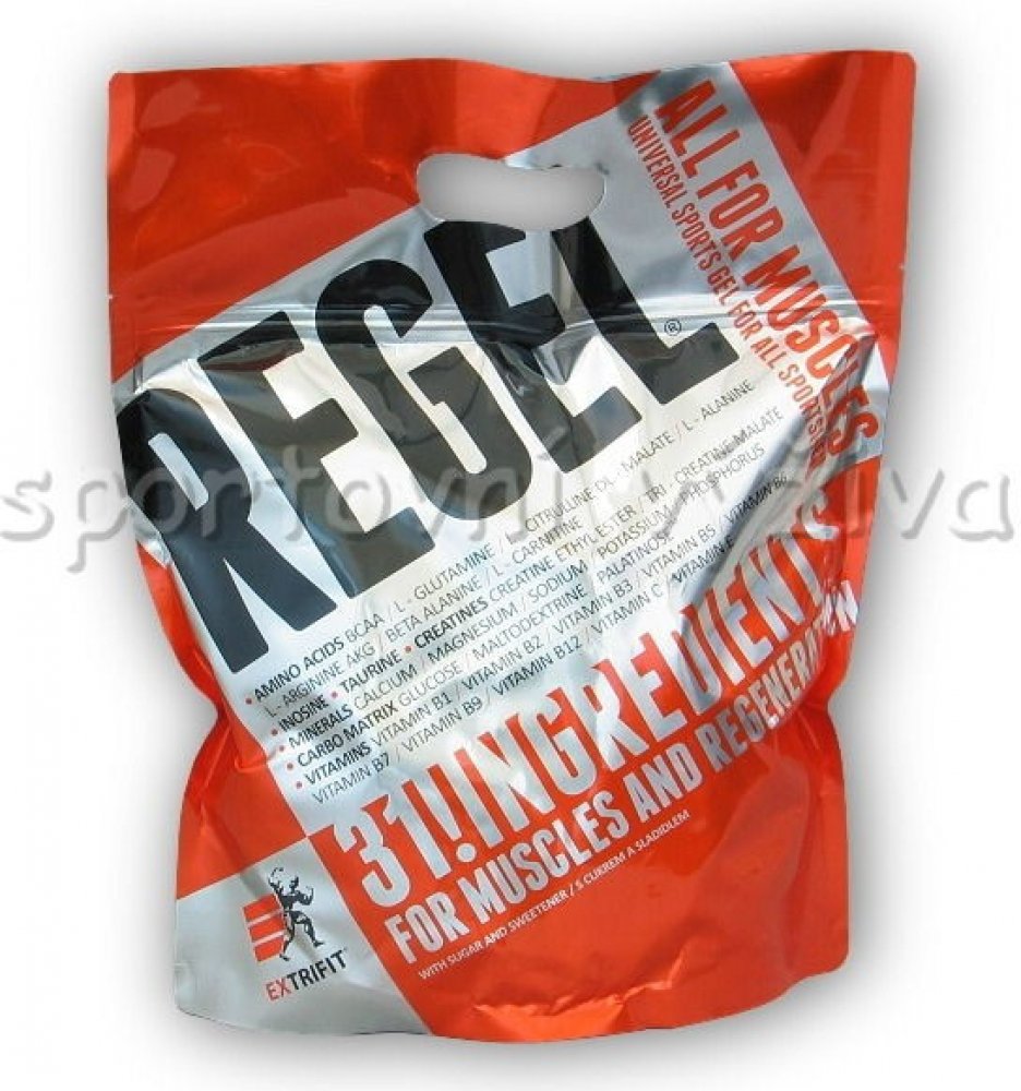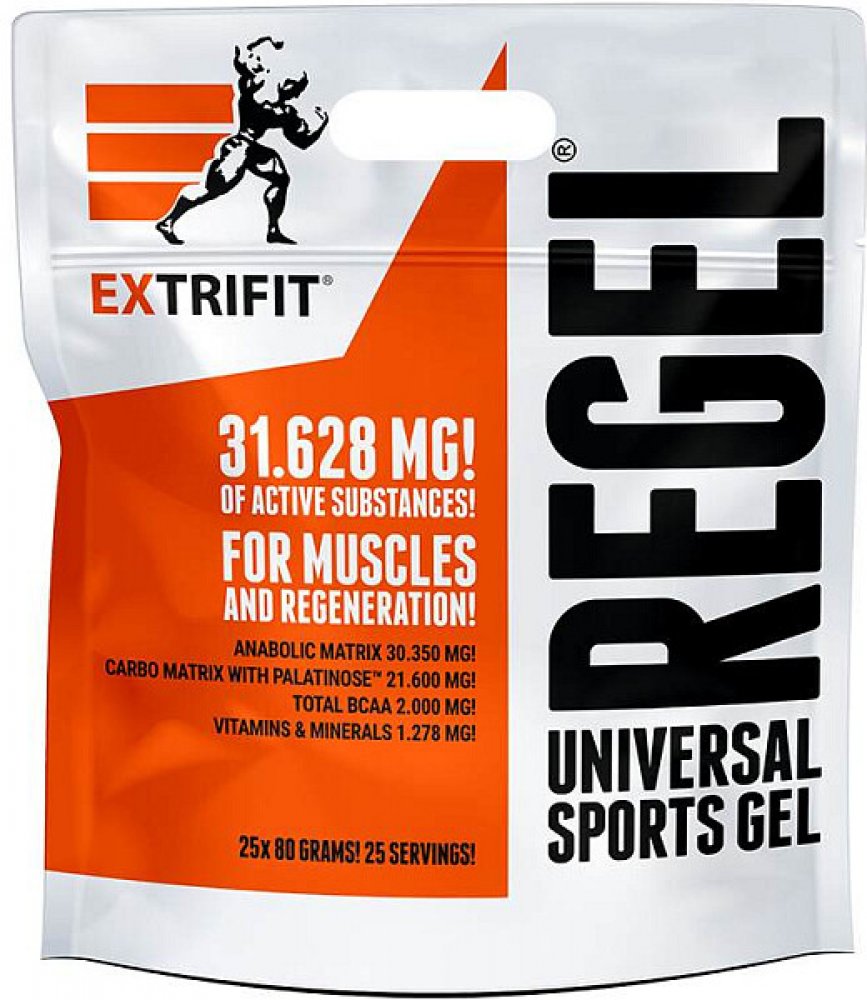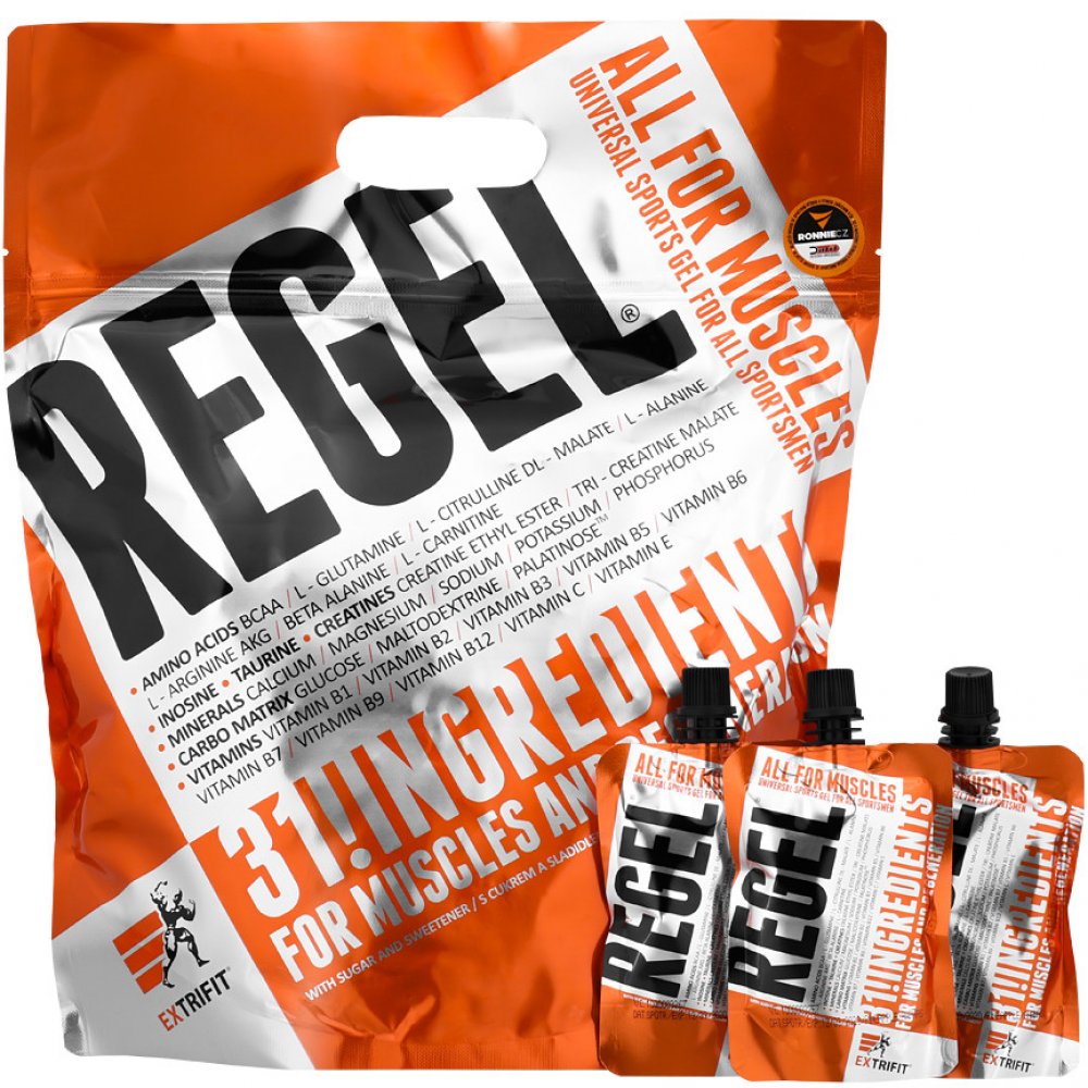 Lámali jste si někdy hlavu nad tím, jaké všechny látky a v jakém množství máte dávkovat pro urychlení regenerace po tréninku? Jaké přijímat sacharidy, jak dávkovat aminokyseliny nebo kolik užívat glutaminu a kreatinu pro odvrácení katabolismu po tréninku? Firma Extrifit vyslyšela tyto Vaše časté dotazy! Regel® je dokonale sestaveným komplexem všech látek, které sportovec nutně potřebuje doplnit v průběhu a po skončení tréninku! Regel® obsahuje pečlivě vyvážený poměr tří druhů sacharidů a volných aminokyselin, anabolizéry, dvě formy kreatinu a komplex vitamínů a minerálních látek. A to vše ve formě hotového gelu připraveného k okamžité konzumaci.