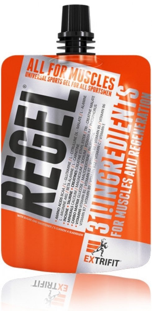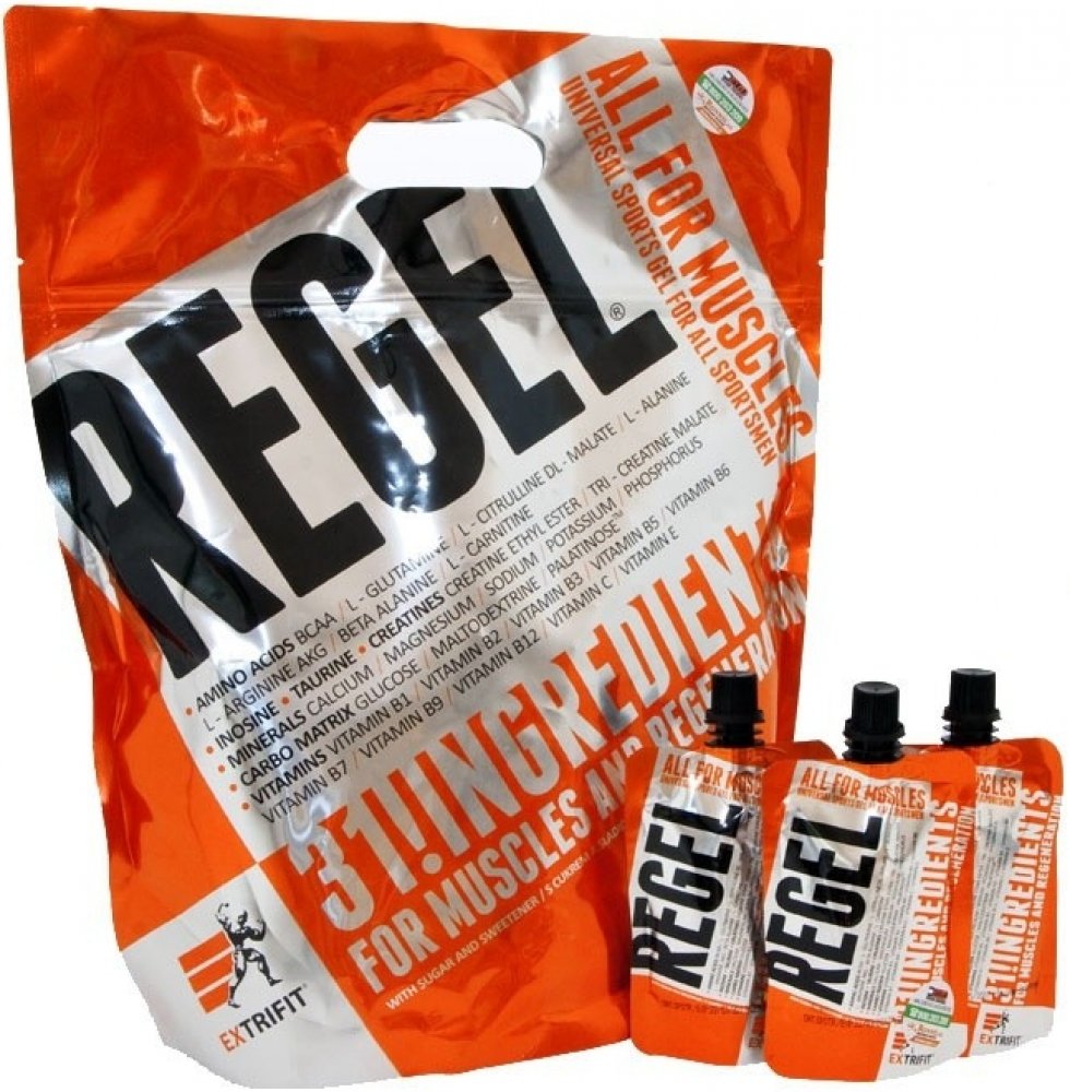 Lámali jste si někdy hlavu nad tím, jaké všechny látky a v jakém množství máte dávkovat pro urychlení regenerace po tréninku? Jaké přijímat sacharidy, jak dávkovat aminokyseliny nebo kolik užívat glutaminu a kreatinu pro odvrácení katabolismu po tréninku? Firma Extrifit vyslyšela tyto Vaše časté dotazy! Regel® je dokonale sestaveným komplexem všech látek, které sportovec nutně potřebuje doplnit v průběhu a po skončení tréninku! Regel® obsahuje pečlivě vyvážený poměr tří druhů sacharidů a volných aminokyselin, anabolizéry, dvě formy kreatinu a komplex vitamínů a minerálních látek. A to vše ve formě hotového gelu připraveného k okamžité konzumaci.