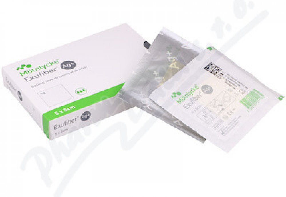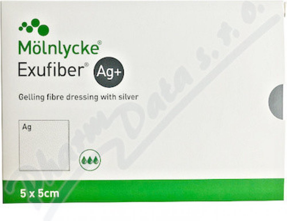 Exufiber Ag+ 5x5 cm 10 ks Želatinové obvazy s rychlým antimikrobiálním účinkem pro vysoce exsudující rány.