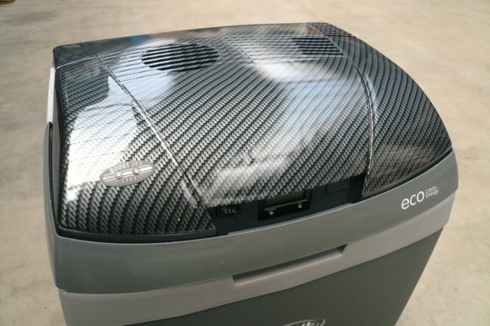 Termoelektrická autochladnička E3000 s víkem v karbonové imitaci. Objemem 23Litrů a nadstandarní tloušťkou izolace pro zvýšený chladící účinek n...