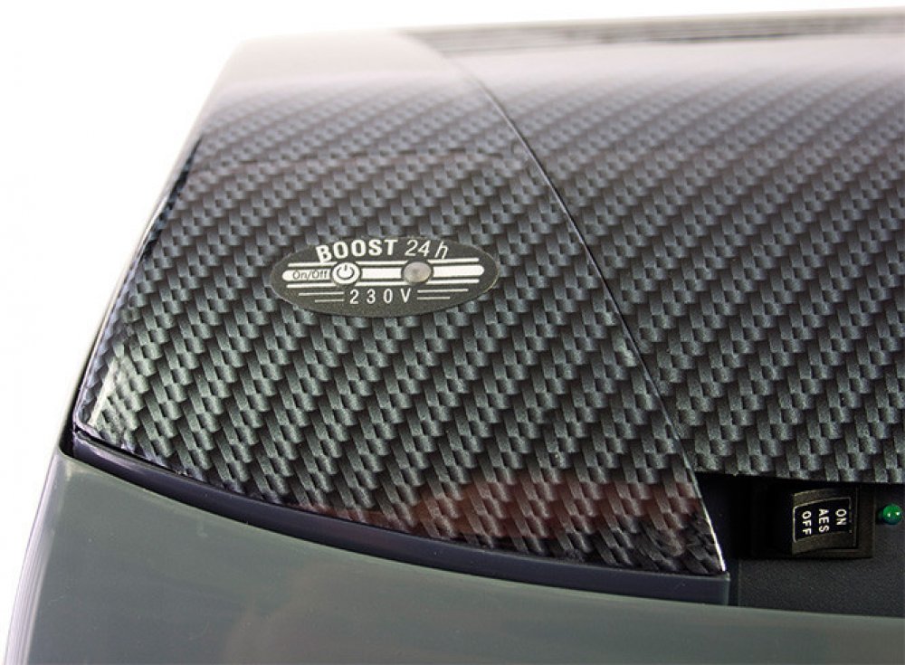 Funkce BOOST. Chladničku při provozu na 230V lze uvést do režimu BOOST stisknutím tlačítka na víku. Režim je indikován LED diodou. Chladnička přejde na 24hodin z režimu ECO na maximální výkon stejný jako při chodu z 12V, režim BOOST lze opětovným stisknutím tlačítka vypnout.