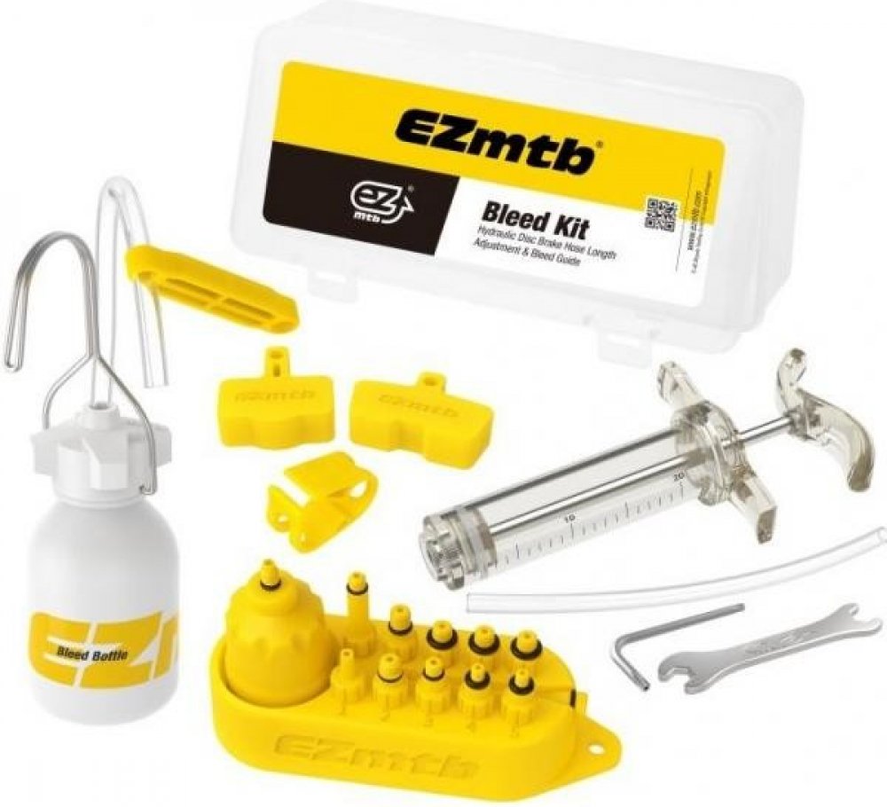 Univerzální odvzdušňovací sada brzd určená pro hobby použití. Sada obsahuje: 1x plnící stříkačka sada 12 kusů plastových adaptérů pro plnění všech typů brzd včetně stojánku 2x silikonová hadička 2x zaškrcovadlo odvzdušňovací nálevka nádobka s háčkem stranový klíč 7/8mm torx T10 a T15 3x vymezovací vložka mezi pístky brzdiče