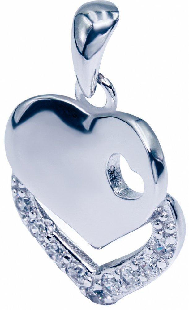 Přívěsek z kvalitního stříbra o ryzosti Ag 925/1000 s příměsí Rhodia - dvě srdce spojené v jedno osázené pomocí sdílených krapen - kapek stříbra - 9 zirkony briliantového brusu.