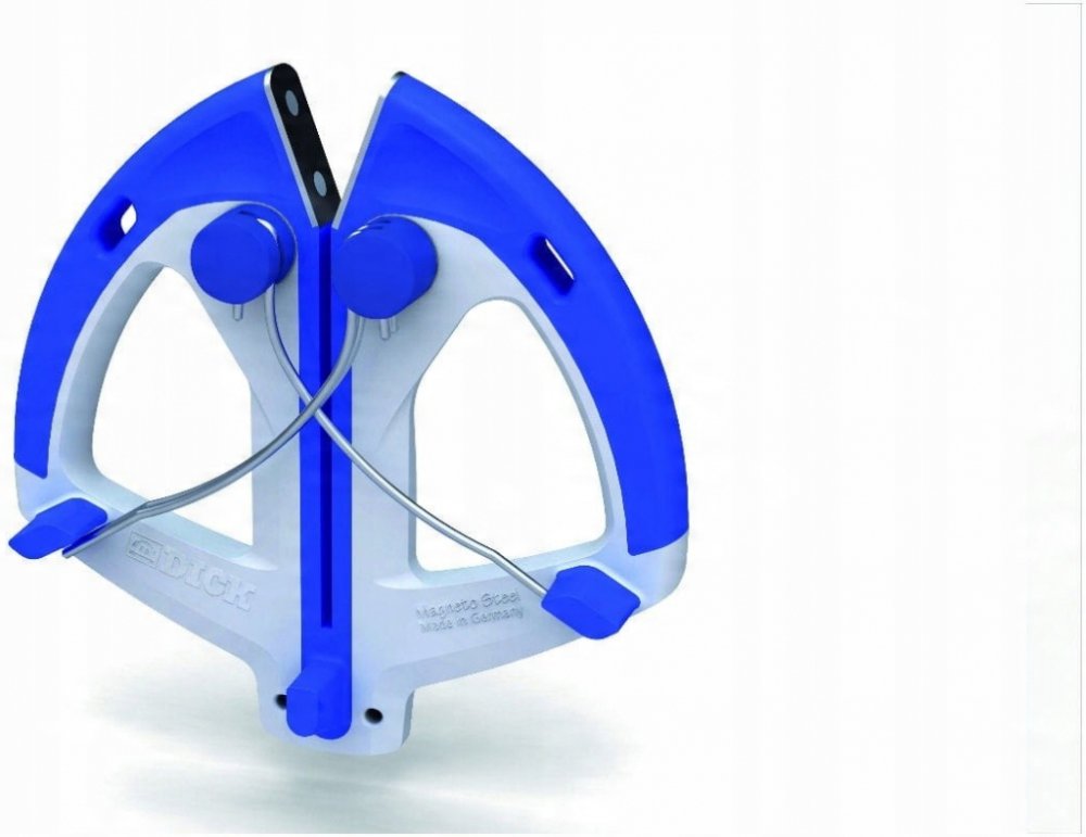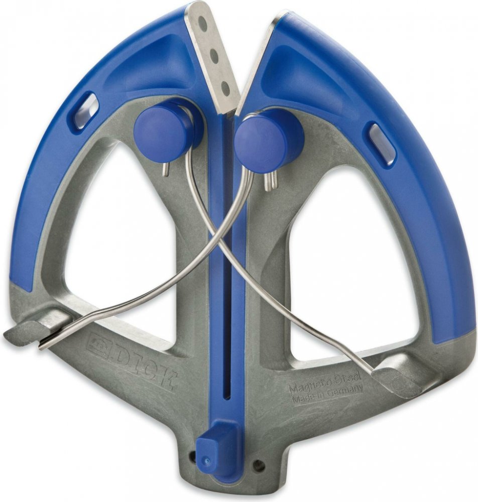 Protahovací brousek "ocílka" s magnetemDICK Magneto Steel Polish Jemný leštící tahBrousek s vylepšenými vlastnostmi. Přestože se na první pohled jedná o zcela jiný brousek, tak brusné segmenty "dráty" jsou shodné s typem DICK Rapid Steel Polish. Avšak tím shoda s tímto typem protahovací ocílky končí. Typ Magneto Steel HyperDrill je nejen konstrukčně odlišný od jiných protahovacích brousků, ale oproti jiným je nově vybaven integrovanými magnety v okrajích vodící části brousku. Magnetické části napomáhají lépe udržet nůž ve stejné poloze vůči brusným segmentům a tím udržet optimální úhel broušení z obou stran broušeného nože. Dále tento brousek má na okraji vodící brusné části nerezové chráničky, snižující poškození brousku broušeným nožem. Stejně jako ostatní protahovací brousky je tento brousek vybaven otvory pro pevné uchycení na pracovišti a nebo jen pro zavěšení. Protahovací brousky "ocílky" dokážou plnohodnotně nahradit klasické ocílky. Svou konstrukcí zajišťují stále stejný úhel broušení. Protahovací ocílky jsou mnohdy lépe využitelné především v gastronomii a v domácnostech právě pro svou nenáročnou obsluhu, kterou zvládne téměř každý. Broušení se provádí jednoduchým způsobem. Jednou rukou přidržujeme protahovací brousek brusnými segmenty(brusnými dráty) směrem k sobě a druhou rukou protahujeme ostří nože mezi brusnými segmenty směrem dolů a zároveň směrem k sobě. Broušení nože provádíme směrem od rukojetě nože ke špici nože.Výrobek Německé firmy F.Dick