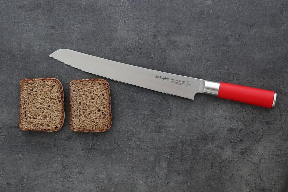 Dick zoubkovaný nůž na pečivo ze série Red Spirit je určen pro krájení chleba, ale i baget a dalšího pečiva větších rozměrů. Zoubky jsou v tomto případě velmi účinné, nůž se do čerstvých křupavých produktů "neboří" a výsledkem je rovnoměrný řez. Zubaté ostří navíc vydrží velmi dlouho ostré.