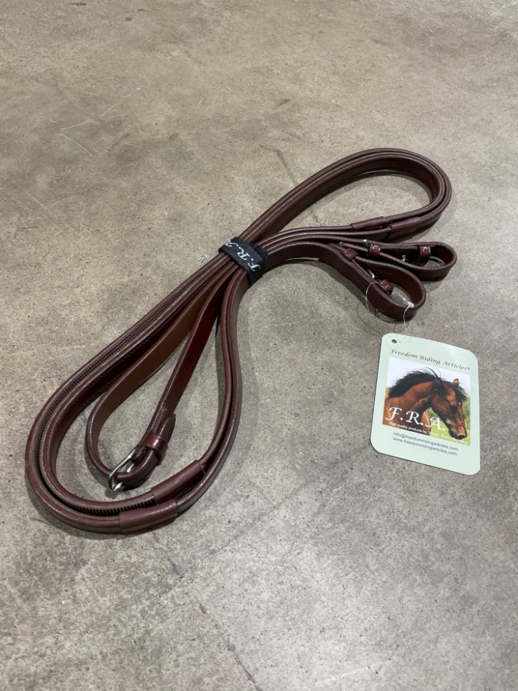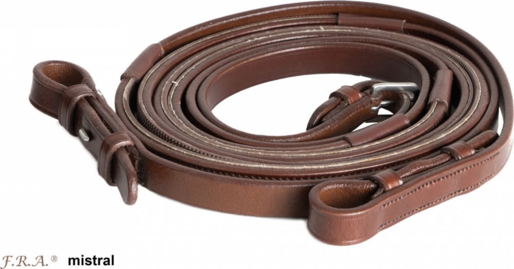 Celokožené otěže Mistral od značky F.R.A. Uprostřed je lze rozdělit sponou. Na obou koncích otěže jsou vybaveny háčkem pro rychlé a snadné zapínání. Otěže jsou k dispozici ve dvou délkách. V oblasti držení jsou vybaveny pogumovanou plochou.