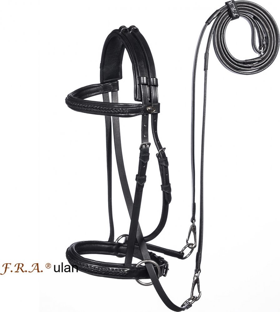 Bezudidlová uzdečka Ulan F.R.A. je vyrobena z vysoce kvalitní kůže. Tento typ uzdečky vede zkřížený řemen z nátylníku a má tak možnost vytvářet nejkomplexnější rozložený tlak od týlu přes žuchvy až po nos a bradu. Nátylníková spojka je vypodložena měkkou kůží a velmi dobře rozkládá tlak. Křížový řemen je vyroben z ploché kůže, která zajišťuje jemnější působení. Uzdečka je zdobena prošíváním na čelence a nánosníku. Dodávána včetně celokožených otěží s karabinkami. V rámci bezudidlového diagramu F.R.A. spadá pod číslo 5.