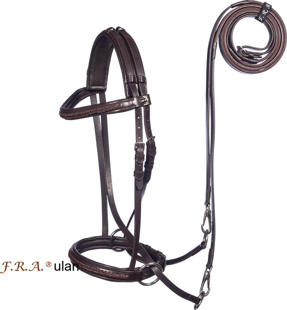 Bezudidlová uzdečka Ulan F.R.A. je vyrobena z vysoce kvalitní kůže. Tento typ uzdečky vede zkřížený řemen z nátylníku a má tak možnost vytvářet nejkomplexnější rozložený tlak od týlu přes žuchvy až po nos a bradu. Nátylníková spojka je vypodložena měkkou kůží a velmi dobře rozkládá tlak. Křížový řemen je vyroben z ploché kůže, která zajišťuje jemnější působení. Uzdečka je zdobena prošíváním na čelence a nánosníku. Dodávána včetně celokožených otěží s karabinkami. V rámci bezudidlového diagramu F.R.A. spadá pod číslo 5.