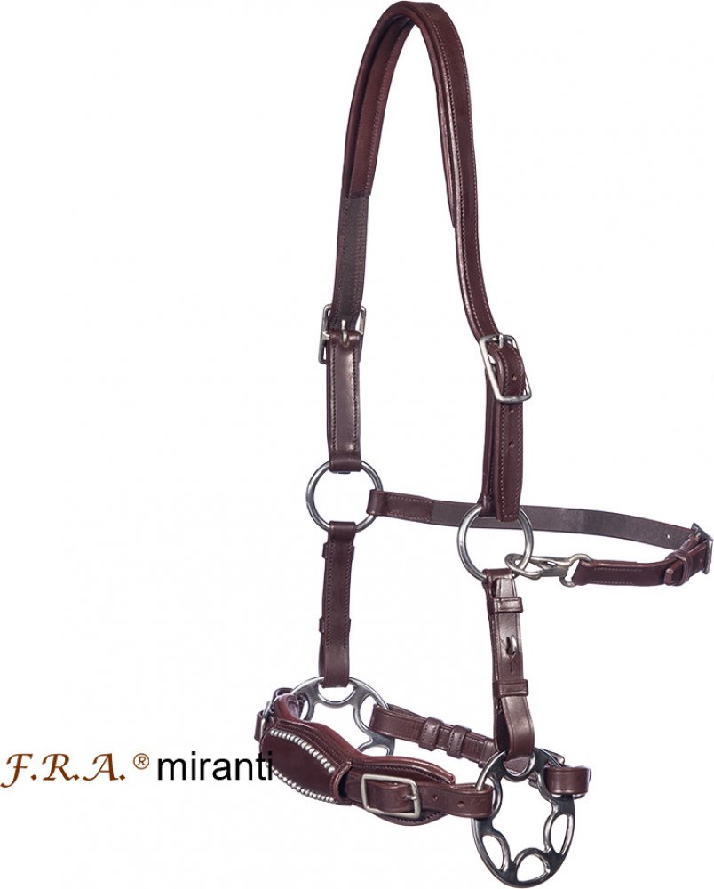 Kvalitní komplet bezudidlové kožené uzdečky a hackamore od značky F.R.A. Tato uzdečka má anatomický tvar a je speciálně sestavena, tak aby se nepřetáčela a zůstala na správném místě. Uzdečka je vybavena měkkým polstrováním. Disponuje širokým nánosníkem, který je zdoben stříbrnými cvočky. Nemá typický podhrdelník, ale disponuje tzv. balančním řemenem, který je umístěn níže než klasické podhrdelníky, tím dochází ke zvýšení stability uzdečky a zvýšení komfortu pro koně. Uzdečka je dostupná pouze v univerzální velikosti, jelikož je rozpětí úprav uzdečky velice široké, je ale vhodná zejména pro cob a full. V rámci bezudidlového diagramu F.R.A. spadá pod číslo 2.