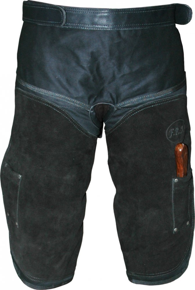Podkovářská zástěra s koženými prvky a s vyztuženou plochou na stehnech. Zástěra má zapínání v pase na principu pásku a okolo nohou pomocí suchého zipu. Na každé straně je kapsa na nože, magnet nebo drobné nářadí. Zástěra v sobě neobsahuje žádný magnet.