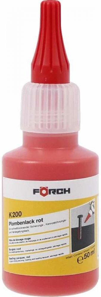 Rychleschnoucí bezpečnostní a značkovací lak Förch K200 slouží k zajištění šroubů proti nechtěnému uvolnění a neoprávněné manipulaci. Po zaschnutí vytváří pevnou ochrannou vrstvu, která je odolná vůči vodě, oleji, benzínu i běžným chemikáliím.