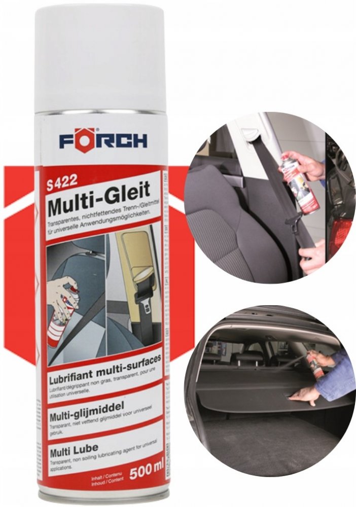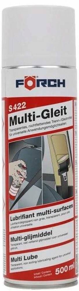 Forch Multi Spray kluzný S422 je pokročilý přípravek s všestranným využitím, ideální pro zefektivnění a ochranu prvků ve vozidlech, průmyslu i každodenních aplikacích. Jeho nemastné, transparentní složení a obsah silikonu zajišťují vynikající kluzné, ochranné a pečující vlastnosti.