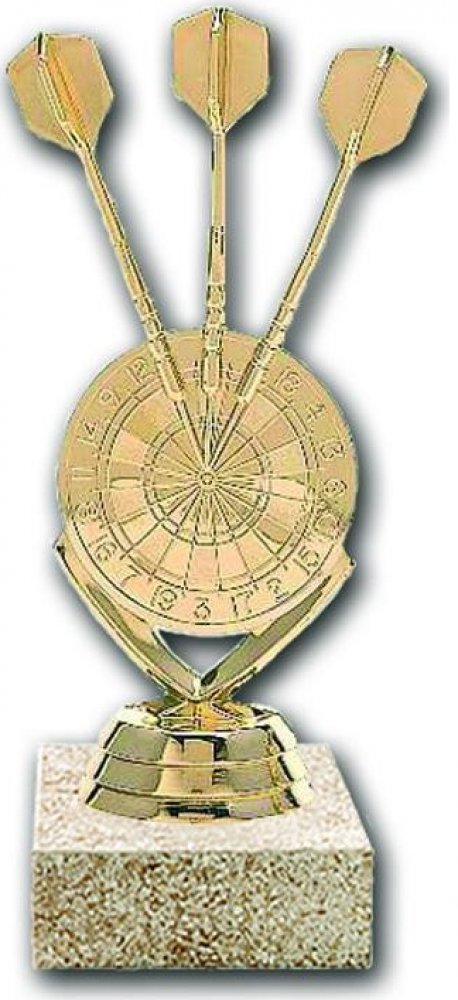 Terč se šipkami na mramoru pískové barvy. Výška sošky včetně mramoru je 14 cm. Na mramor lze umístit štítek, který lze potisknout textem dle Vašich požadavků. Na štítek této velikosti se vejdou 3 řádky. Do řádku cca 20 znaků.
