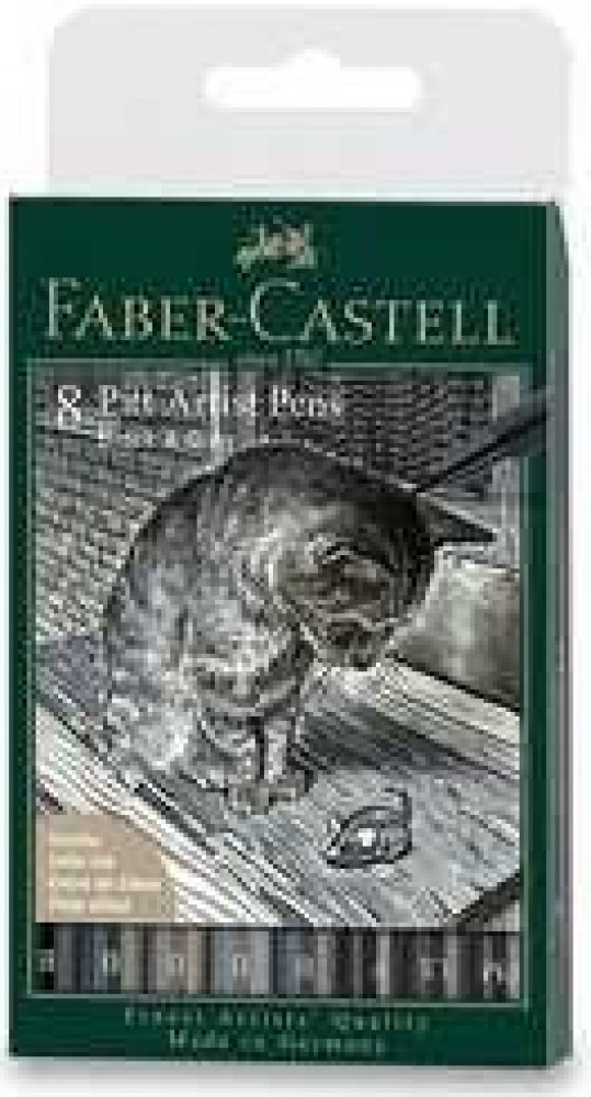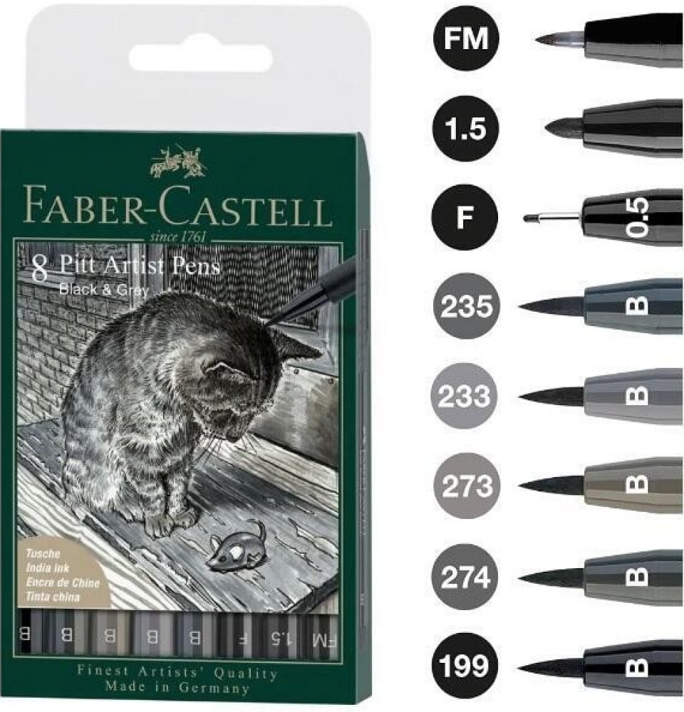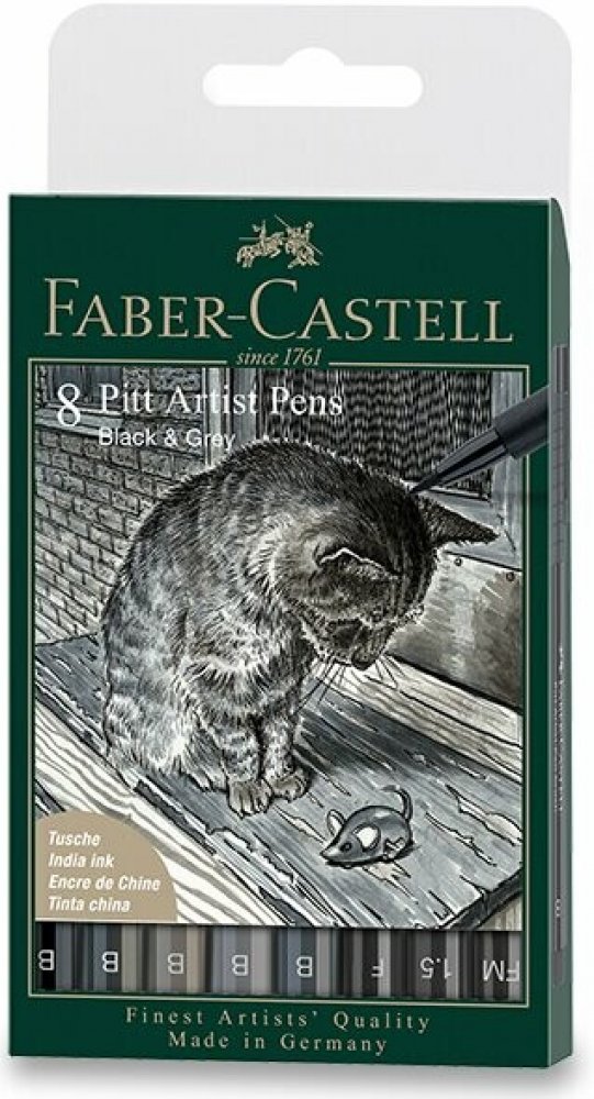 Popisovač Pitt Artist Pen, plast. pouzdro 8 ks, Black & Grey Kresba tuší má velice dlouhou, uměleckou tradici. Výrazová síla tuše a její odolnost proti stárnutí, jakož i kombinační možnosti s mnoha jinými malířskými technikami, činí toto médium odjakživa zajímavým pro umělce a grafiky. Společnost Faber-Castell sjednotila všechny tyto přednosti uměleckých tuší do moderního, jednorázového popisovače s názvem Pitt Artist Pen. Vysoce pigmentovaná a barevně stálá kreslící tuš je ideální pro uměleckou a profesionální tvorbu, pro vytváření skic, výkresů, návrhů, módních kreseb a ilustrací.