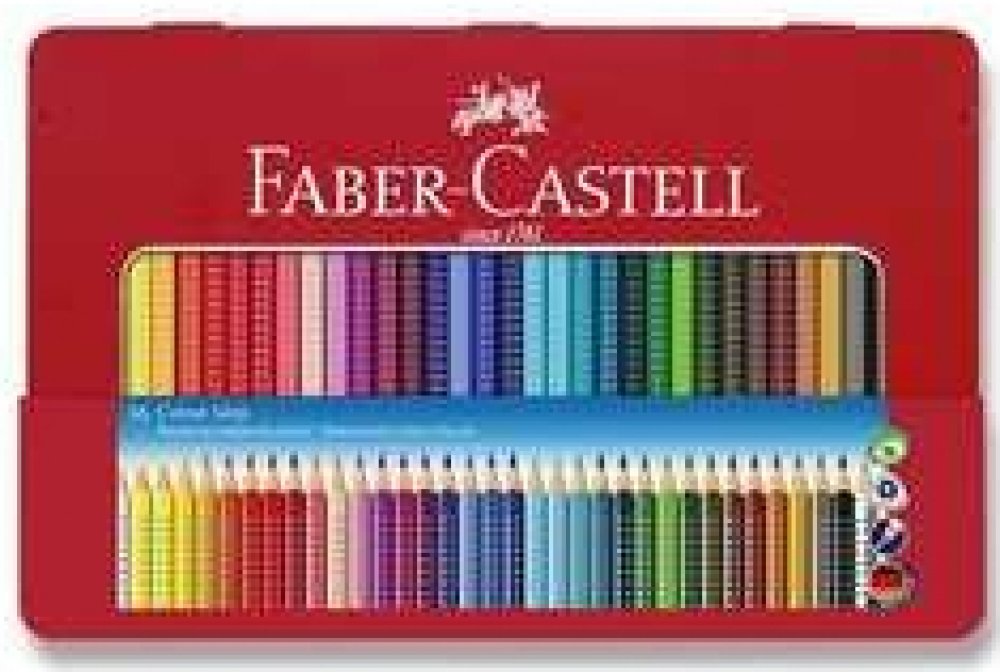 Souprava 36 kvalitních trojhranných pastelek Faber-Castell Grip s patentovanou GRIP zónou v plechové krabičce. Pastelky mají vodou rozmyvatelnou tuhu, která umožňuje vytvářet efekty akvarelu.