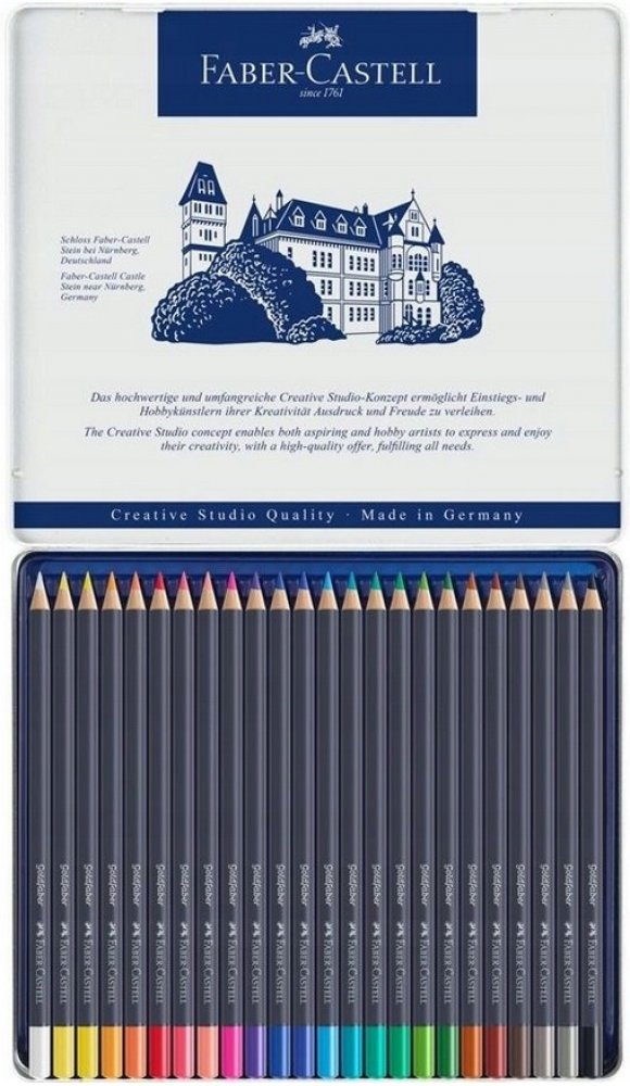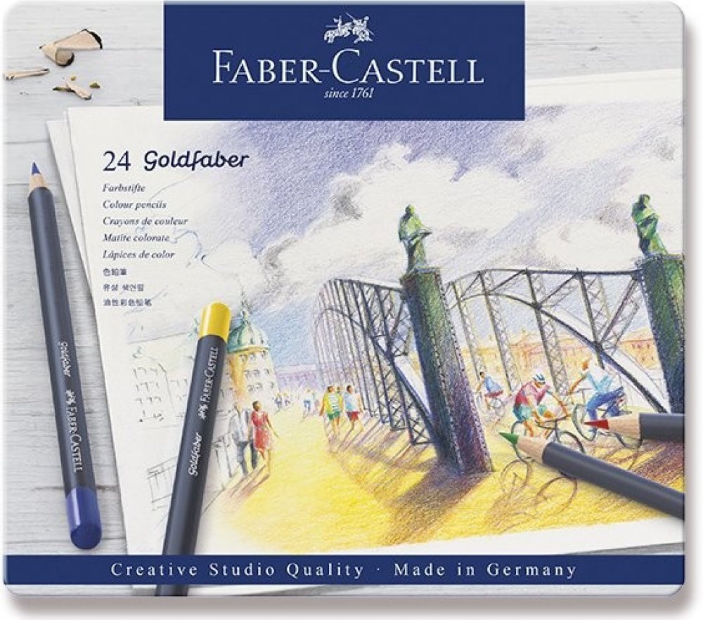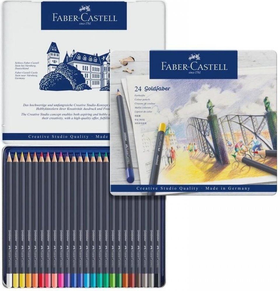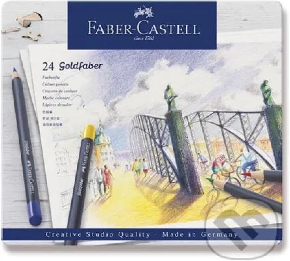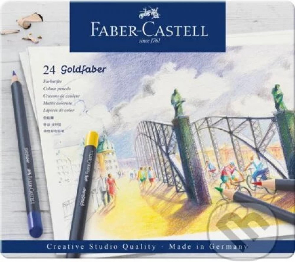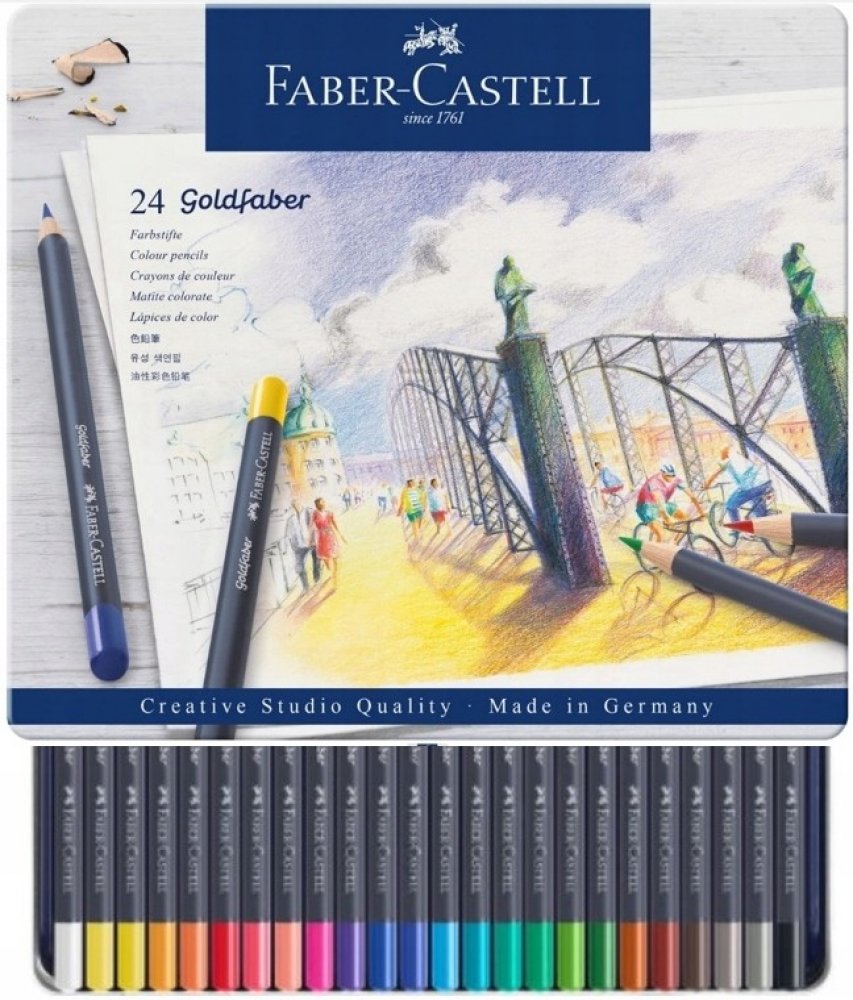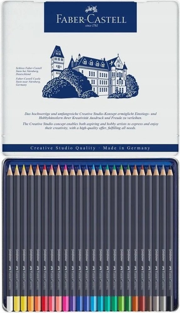 Umělecké pastelky špičkové kvality v kovové kazetě - 24 ks Umělecké pastelky Goldfaber Vás okouzlí jemnými, sytými a zářivými barvami. Vysoce kvalitní materiály a inovační technika výroby způsobuje, že jsou pastelky zvýšeně odolné proti polámání, mají vynikající světlostálost i voděodolnost. Barvy se nerozmazávají a skvěle se přizpůsobují různým technikám kreslení i úrovni kreslířských dovedností....