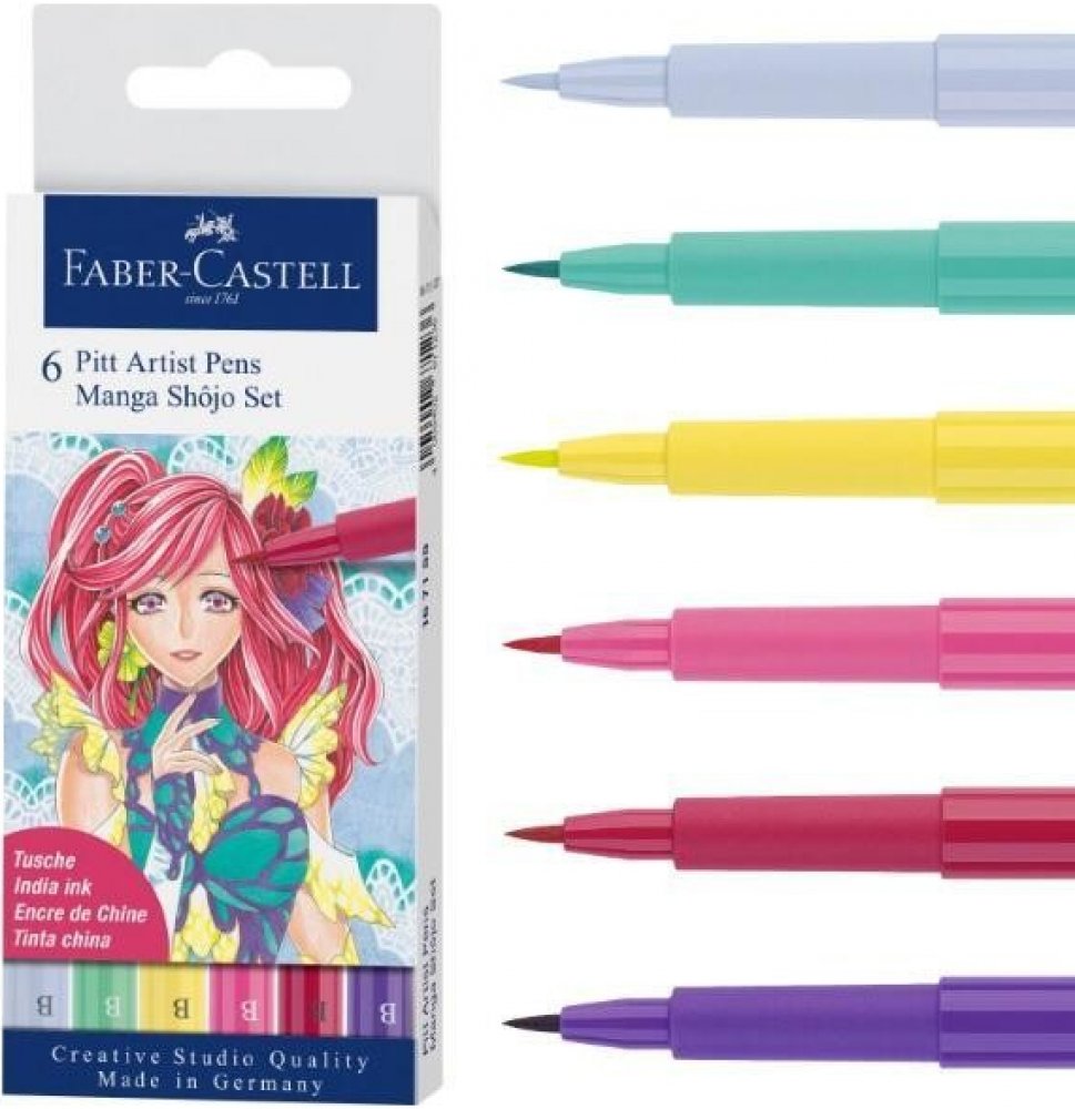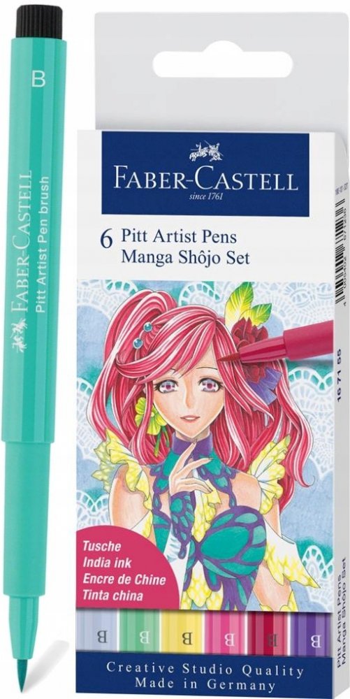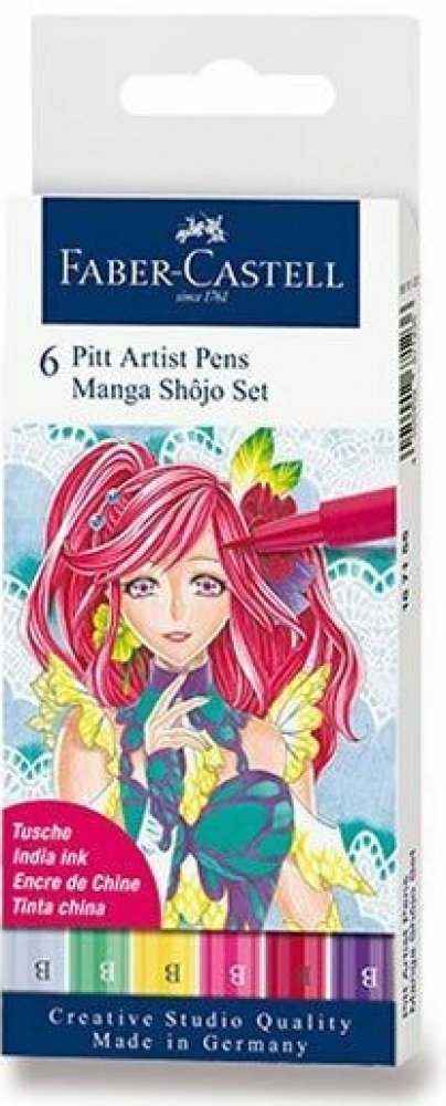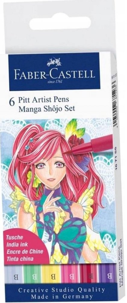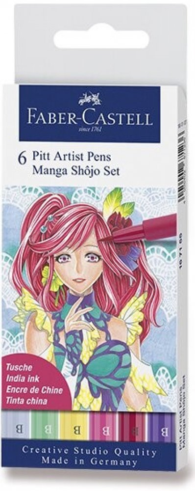 Pitt Artist Pen Manga Shojo II Set 6 ks Moderní umělecké popisovače s různými hroty pro tušové skicování, kreslení a malbu v plastovém pouzdře s motivy komiksů Manga. Obsahují pigmentovanou tuš s vysokou barevnou stálostí, voděodolnou a permanentní. Barva neprosakuje skrz papír, je bez kyselin, zápachu, pH neutrální. Sada obsahuje popisovače v barvách č. 104, 127, 129, 136, 161, 220. Hrot B.