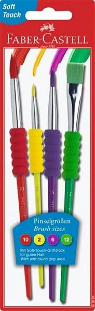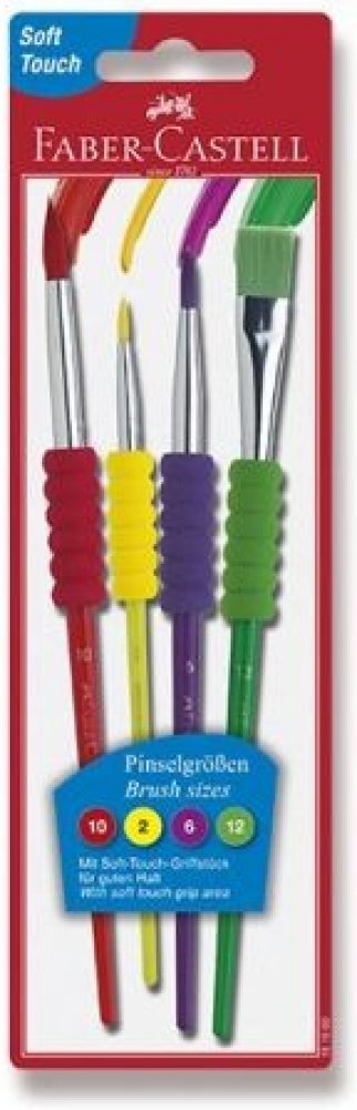 Sada čtyř malířských štětců Faber-Castell Soft Touch, určených zejména pro děti, obsahuje tři kulaté štětce ve velikostech 2, 6 a 10 a plochý štětec velikosti 12. Jsou vyrobeny z pevného, měkkého syntetického vlasu, ze kterého barva nestéká a děti tak mohou tvořit krásné obrázky v jasných, sytých barvách. Štětce Faber-Castell mají navíc ergonomicky tvarovanou protiskluzovou rukojeť s pěnovou výplní pro správné držení bez nežádoucího tlaku na prsty. Dětské štětce na malování jsou dělané ve čtyřech veselých barvách pro odlišení velikosti - žluté, zelené, červené a fialové.Vlastnosti štětců Faber-Castell Soft Touchsada obsahuje 3 kulaté štětce a 1 plochý různých velikostíštětce jsou vyrobeny ve 4 veselých barváchměkká, protiskluzová rukojeť s pěnovou výplnívyrobeny ze syntetického vlasudobré pokrytí barevideální sada štětců do školy i pro volný čas