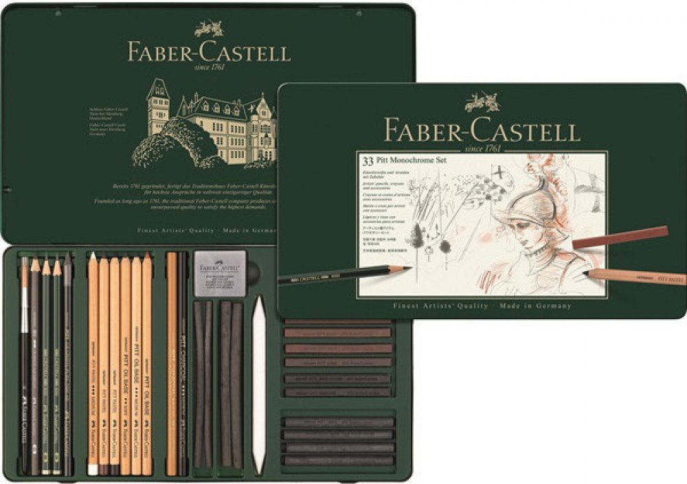 PITT Monochrome grafitové tužky, PITT pastely, PITT Monochrome křídy, grafitové tužky Faber Castell 9000, PITT Monochrome lisovaný a přírodní uhel, uměleckou stěrací pryž a další doplňky.