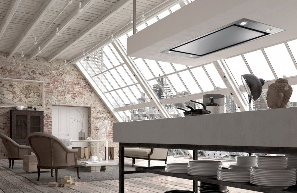Plné zapuštění digestoře do stropního podhledu zajišťuje maximální volný prostor nad pracovní plochou a kuchyň se díky tomu stává vzdušnější.