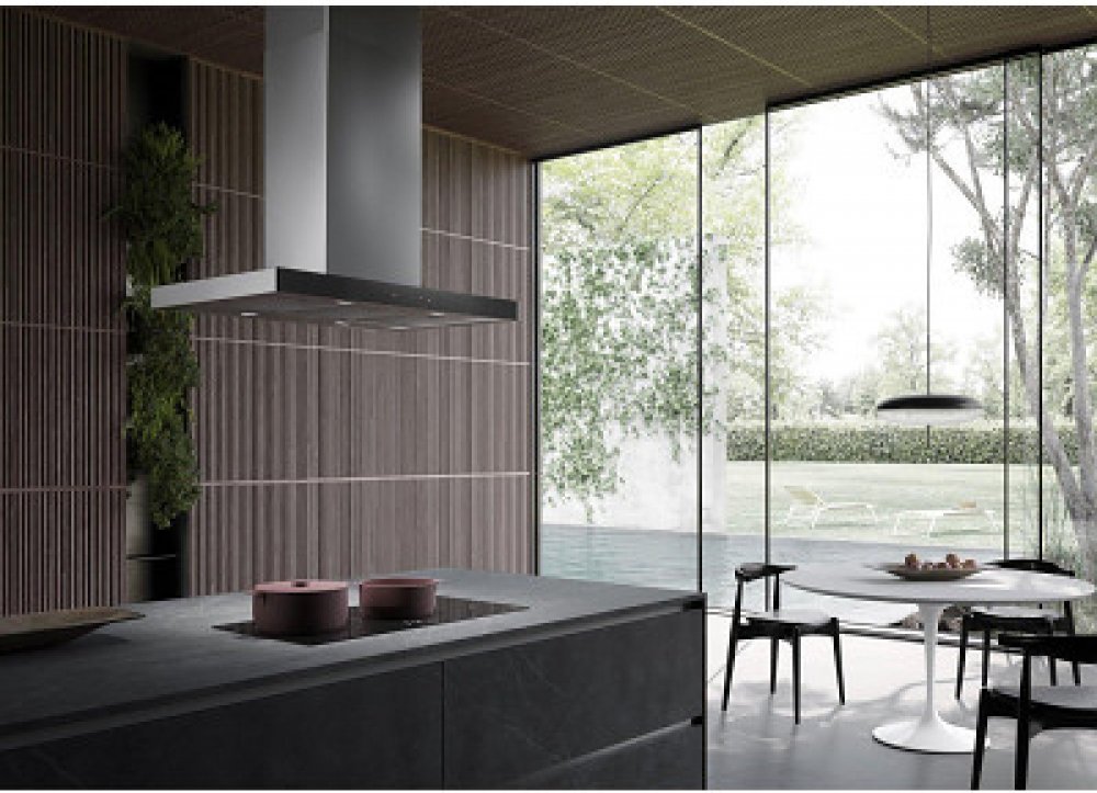 Lehkost a precizní zpracování nerezové oceli a skla jsou hlavní atributy výkonné, funkční a elegantní ostrůvkové digestoře STILO GLASS SMART ISOLA.