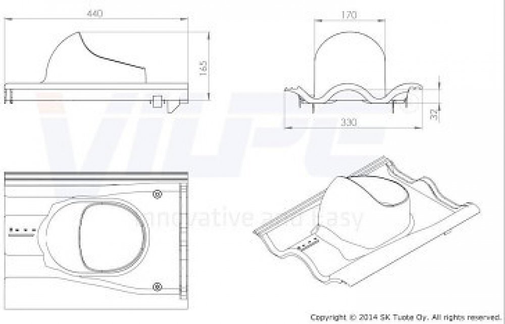 Průchodový prvek pro šikmou střechu nahrazuje jednu dvouvlnnou betonovou tašku šířky 330 mm s výškou profilu 27–40 mm. Délka průchodového prvku je 440 mm.