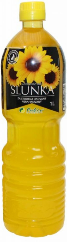 Fabio Slunečnicový olej SLUNKA za studena lisovaný 1 l (PET) Složení: slunečnicový olej Chraňte před slunečním zářením. Uchovávejte v temnu a chladu. Po otevření spotřebujte do 1 měsíce po otevření. Země původu: Česká republika Slunečnicový olej SLUNKA za studena lisovaný je jedlý jednodruhový rostlinný olej, nerafinovaný.