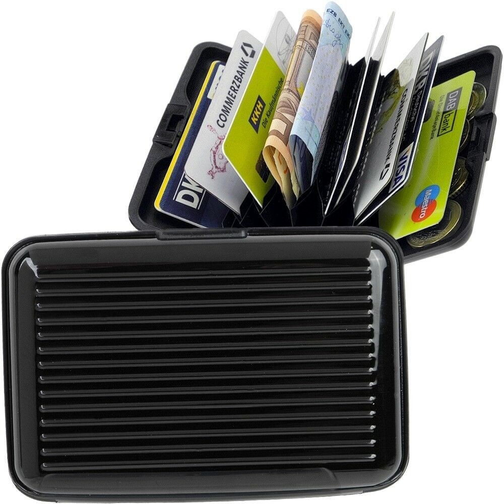 Univerzální hliníkové pouzdro německé značky Fabrizio v černé barvě s přihrádkami uvnitř. S tímto pouzdrem se budete cítit sebejistě a budete mít dobrý pocit z toho, že všechny vaše doklady jsou v bezpečí. Ochrana RFID dokáže zablokovat příchozí bezdrátové komunikace a zamezí tak nežádoucímu čtení choulostivých dat z Vašich kreditních a bankovních karet.