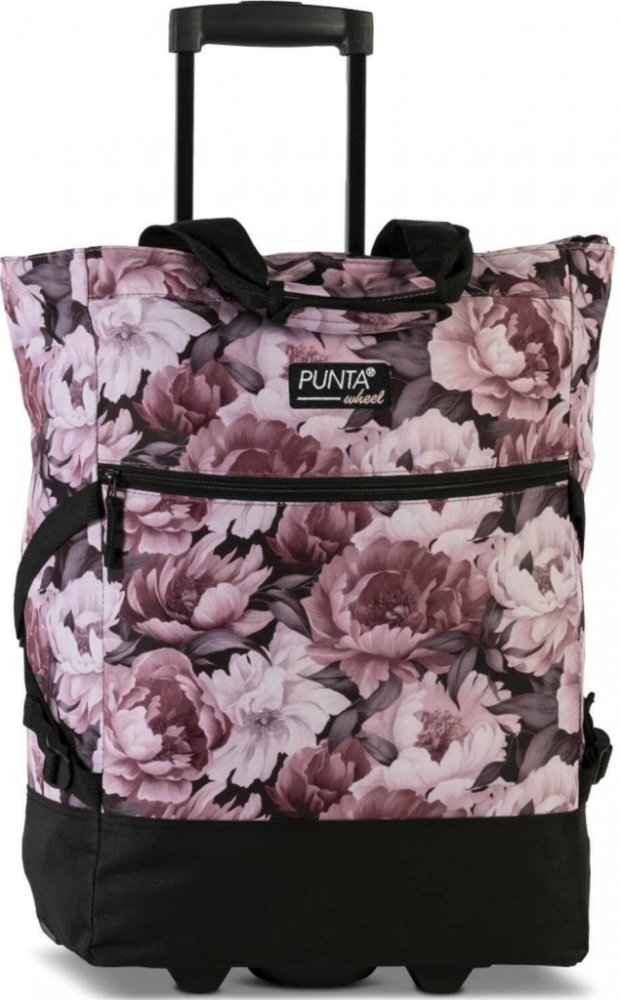 Praktická taška nejen na nákupy v moderním designu značky Punta v kombinaci černé a fuchsiové barvy s potiskem květů pivoněk. Tuto tašku můžete využít i na sport nebo na cestování, disponuje velkým objemem, dostatkem prostoru, je snadno omyvatelná a vyrobena ze zesíleného polyesteru. Inline kolečka umožňují jednoduchý pohyb po jakémkoli povrchu.