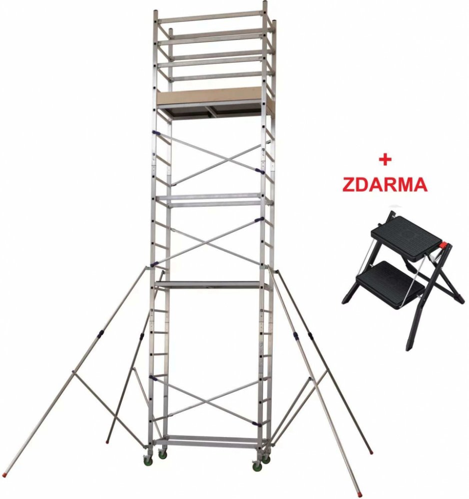 Pojízdné hliníkové lešení ALTO 1+2+3 je vhodné pro práce v interiérech, ale i na zahradě nebo na stavbě. Pracovní podlážku je možno nastavit do maximální výšky 490 cm a pracovat ve výšce až 690 cm. Nosnost lešení je 190 kg (200 kg/m2). Jedná se o lehké lešení, které má většinu spojů bezšroubových a vyniká tak velice rychlou montáží a demontáží. Lešení má 4 brzditelná kolečka pro jednoduchou manipulaci (průměr 125 mm). Při použití 2.a 3.modulu je nutné použít stabilizátory, jejichž poloha je jednoznačně konstrukčně vymezena pomocí úchytu. Stabilizátory jsou teleskopické a jejich délku lze měnit pomocí modrých plastových objímek. Stabilizátory jsou již součástí lešení a není potřeba je dokupovat. Za příplatek 4.700,- Kč vč. DPH je možné doobjednat rozšíření základny lešení kód ALT-LIV viz související položka níže. Tento typ pojízdného lešení je vhodný i pro použití na schodech nebo v nerovném terénu. Ke každému lešení nyní zdarma kvalitní ocelové schůdky Hailo 4310-181 v hodnotě 990 Kč Rozměr pracovní podlážky: 68x141 cm Celkový rozměr včetně koleček: 82x165 cm Maximální výška pracovní podlážky: 490 cm Celková výška lešení: 620 cm Maximální pracovní výška: 690 cm