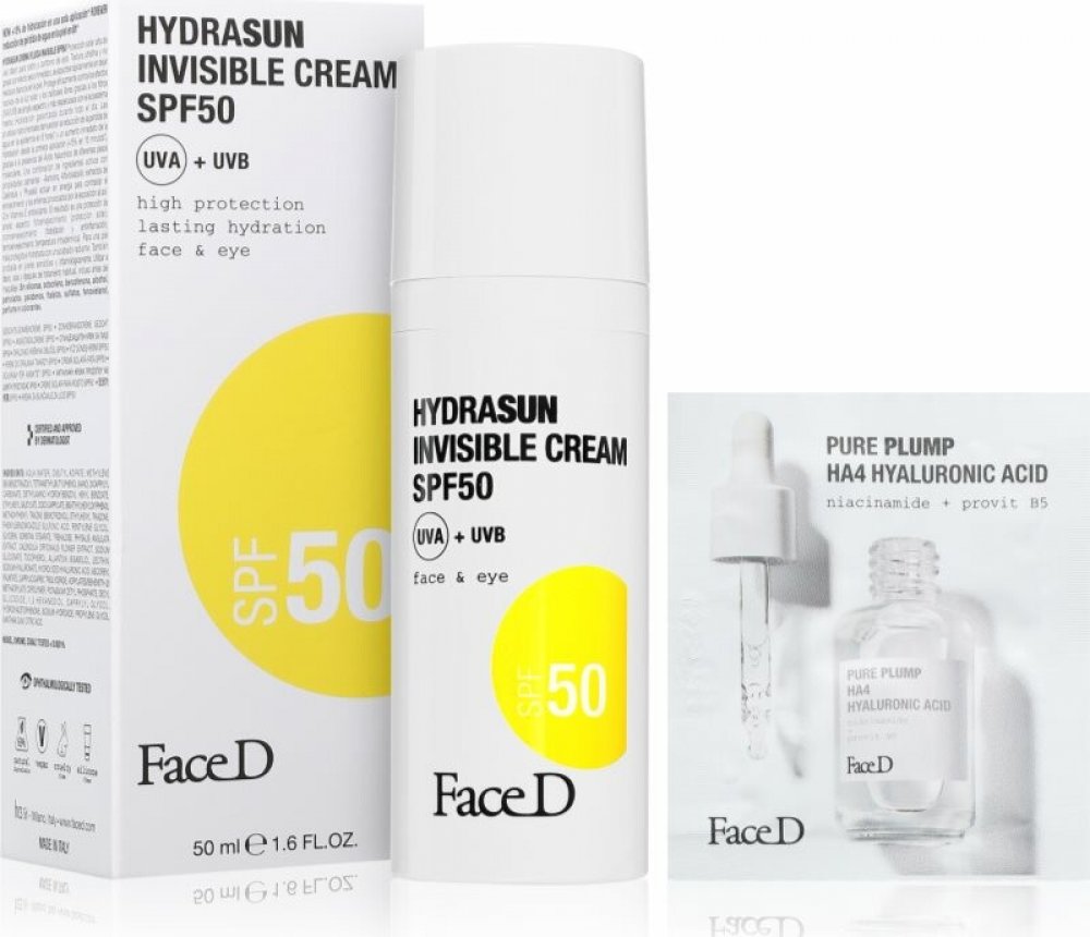 Face D Hydrasun, 50 ml, Ochrana proti slunečnímu záření pro ženy, Chraňte svou kůži před předčasným stárnutím i jiným poškozením způsobeným slunečním zářením. Opalovací přípravek Face D Hydrasun vystaví účinný obranný štít paprskům UV záření a pomůže vám tak předcházet nejen spálení, ale i vzniku pigmentových skvrn, snížení kožní pružnosti, úbytku kolagenu a dalším projevům stárnutí kůže. V neposlední řadě pak významně sníží riziko vzniku rakoviny kůže. Vlastnosti: chrání kůži před UVA i UVB zářením dodává pokožce potřebnou hydrataci má zklidňující účinky rychle se vstřebává nezanechává na kůži bílé fleky hodí se pro citlivou pleť Složení: veganský produkt dermatologicky testováno obsahuje 69 % složek přírodního původu bez alkoholu bez silikonů bez parfemace kyselina hyaluronová – váže na sebe velké množství vody a intenzivně hydratuje vitamin E – vyživuje, poskytuje antioxidační ochranu před předčasným stárnutím a poškozením způsobeným volnými radikály, pomáhá vyhlazovat vrásky a obnovovat pevnost a pružnost kůže Jak používat: Naneste na čistou pleť před pobytem na slunci.