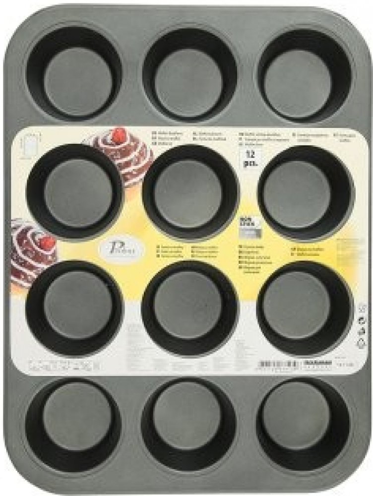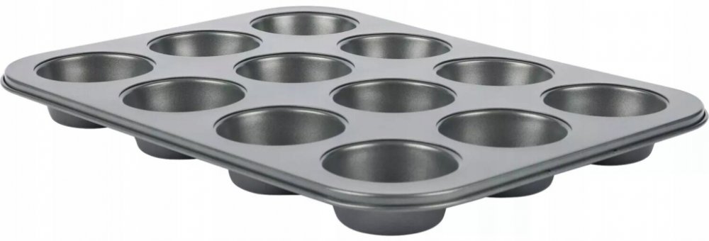 Šedá forma na muffiny Fackelmann s nepřilnavým povrchem pro 12 muffinů. Rozměry formy: délka 345 mm, šířka 260 mm, výška 30 mm. Rozměry jednoho muffinu: výška 30 mm, průměr 70 mm. Vyrobeno z kovu, ideální pro pečení lahodných domácích muffinů.