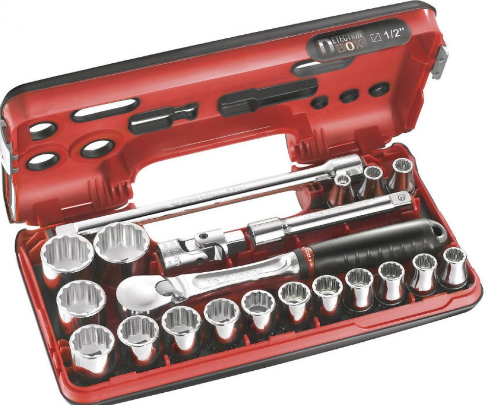 Koncepce "Detection BOX" umožňuje okamžitou kontrolu obsahu i při zavřeném boxuSnižuje nebezpečí zapomenutí nářadí ve stroji, nebo v motoru po ukončení práce, tím se výrazně snižuje riziko nehodyTento box splňuje certifikace FOD* vyžadované v některých odvětvích průmyslu apod.Hlavice jsou pevně uloženy na svých místechKovové osy závěsůPevná konstrukce z polymeru PC/PBT, velmi odolná vůči nárazům a chemikáliímPlochy opatřené měkkým termoplastickým elastomerem chrání povrchy před poškrábáním Obsah sady:17x Hlavice 12hranné: 8, 10, 11, 12, 13, 14, 15, 16, 17, 18, 19, 21, 22, 24, 27, 30, 32 mm1x Ráčna s přepínací páčkou prachutěsná (SL.161)2x Prodlužovací nástavce 130 a 250 mm (S.210 a S.215)1x Univerzální kardan (S.240A) Celková hmotnost: 3,68 kg