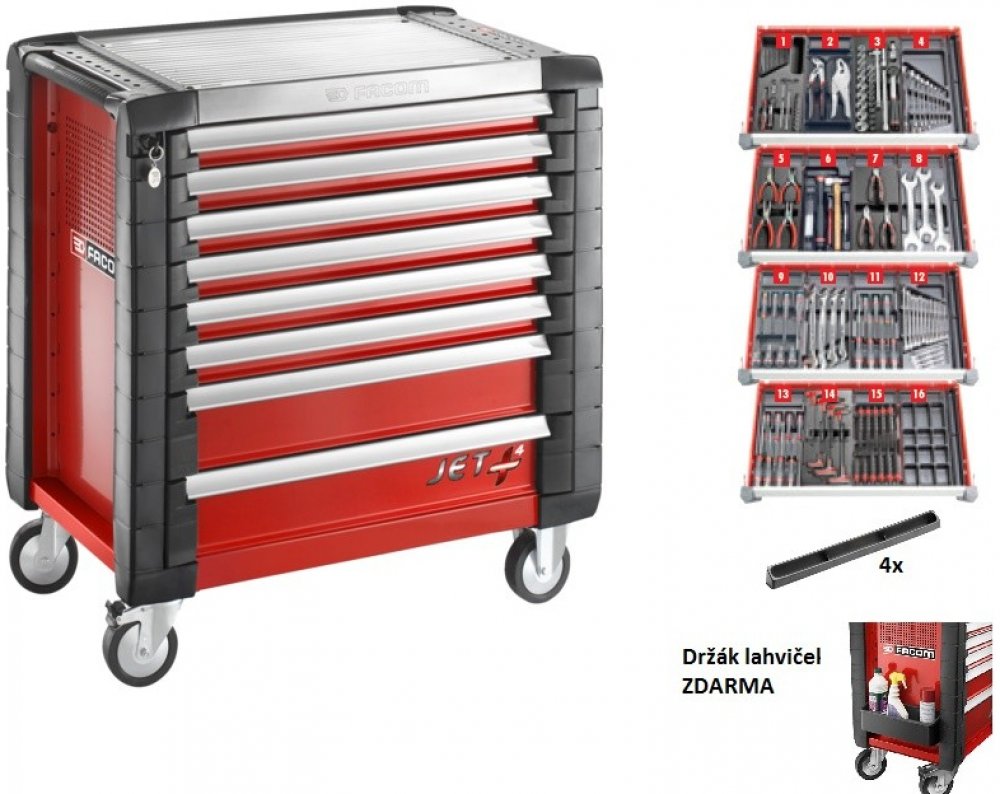 • 8 zásuvek: 6x 60 mm (24 modulů), 2x 130 mm (8 modulů) • Dodáváno s 12 přepážkami pro zásuvky o výšce 60 mm • Celkové rozměry (včetně kol a pracovní desky): 964 x 546 x 971 mm • Rozměry zásuvek: 759 x 421 x 60/130 mm • Maximální nosnost zásuvek 60/130 mm: 25/30 kg • Využitelný objem zásuvek 60/130 mm: 20/40 l • 4 kolečka, O 125 mm: 2 pevná a 2 otočná, z nichž jedno je osazené brzdou • Barva: červená 3020 (1) MOD.R161-26 - 36dílná sada 1/4" nářadí s 6hrannými hlavicemi a bity (2) MOD.PR11 - 2dílná sada upínacích a stavitelných kleští (3) MOD.S161-46 - 26dílná sada 1/2" nářadí s 6hrannými hlavicemi (4) MOD.44-1 - 9dílná sada otevřených stranových klíčů (5) MOD.PCSN - 4dílná sada kleští na pojistné kroužky (6) MOD.MI7 - 7dílná sada úderného nářadí s kladivem GRAPHITE (7) MOD.CPEA0 - 3dílná sada kleští pro mechaniky (8) MOD.44-2 - 3dílná sada oboustranných otevřených klíčů velkých rozměrů (9) MOD.AT3 - 8dílná sada PROTWIST® šroubováků (10) MOD.440-2 - 4dílná sada očkoplochých klíčů velkých rozměrů (11) MOD.ATXR - 7dílná sada šroubováků PROTWIST® Resistorx® (12) MOD.440-1 - 16dílná sada očkoplochých klíčů (13) MOD.AT1 - 8dílná sada PROTWIST® šroubováků (14) MOD.84TZSA - 7dílná sada zástrčných 6hranných klíčů s kuličkou s "T" rukojetí (15) MOD.CG - 11dílná sada opláštěných vyrážečů, průbojníků a sekáčů (16) PL.L384 - Organizér na šrouby a drobné díly 4x Boční žlábek pro zásuvku XL PL.655 ZDARMA držák lahviček JET.A1GXL
