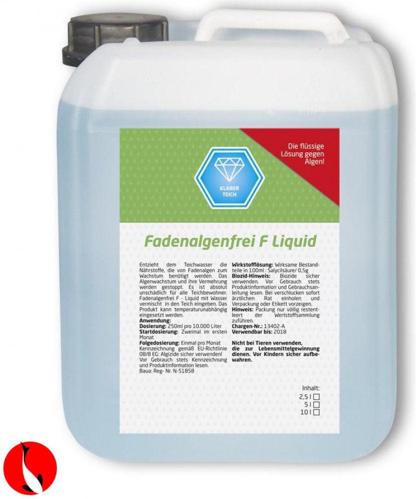 Účinný a šetrný přípravek proti vláknitým řasám speciálně vyvinutý pro jezírka s KOI. Vodní policie efektivně chránící jezírko před řasami v zahradním jezírku. Účinnost přípravku je nezávislá na teplotě vody! Proč koupit přípravek proti vláknitým řasám Fadenalgenfrei F: jednoduché a efektivní řešení pro likvidaci vláknitých řas v zahradním jezírku ničí vláknité i plovoucí řasy a zamezuje jejich dalšímu růstu v zahradním jezírku vyváže z vody živiny, které vláknitá řasa potřebuje pro svůj růst a množení zachovává přirozený biofilm na stěnách a dně jezírka dlouhá léta používaný a prověřený prostředek na celosvětovém trhu vyroben speciálně pro jezírka s KOI, neškodný pro KOI, ostatní ryby a rostliny,... čistě přírodní přípravek, plně biologicky odbouratelný Fadenalgenfre F je čistě přírodní prostředek, neobsahuje algicidy ani biocidy. Díky novému složení je nyní ještě efektivnější a účinnější, navíc nezávislý na teplotě vody. Přípravek vyvazuje z vody živiny potřebné pro růst a rozmnožování řas, které následně umírají obvykle během 4-6 týdnů. Po aplikaci není potřeba vypínat UV lampu. Dávkování přípravku proti vláknitým řasám Fadenalgenfrei F: Fadenalgenfrei F nelze předávkovat. Dávka by měla odpovídat skutečnému objemu vody v zahradním jezírku, nebo být o něco vyšší. Před aplikací je nezbytné nejprve zkontrolovat hodnoty pH, gH a kH! Pokud používáte aktivní uhlí, před aplikací je potřeba ho vyjmout z vody. Po silném dešti nebo po výměně vody je třeba doplnit dávku Fadenalgenfrei F do jezírka. Přípravek se rovnoměrně nasype do jezírka, nerozpouští se ve vodě! Nesypte přípravek na listy vodních rostlin. Dávkování 250 g / 10 000 l vody v jezírku Počáteční aplikace v prvním měsící aplikovat rovnoměrně 2 dávky po 15 dnech, odumřelé řasy odstranit mechanicky z jezírka Udržovací dávka 1 * měsíčně, po odumření a odstranění řas ze zahradního jezírka lze interval aplikace prodloužit Balení 2,5 kg na celou sezónu pro jezírka 10 000 l až 15 000 l Balení 5 kg na celou sezónu pro jezírka 20 000 l až 25 000 l Balení 10 kg na celou sezónu pro jezírka 40 000 l až 50 000 l