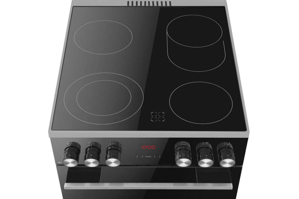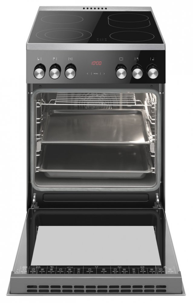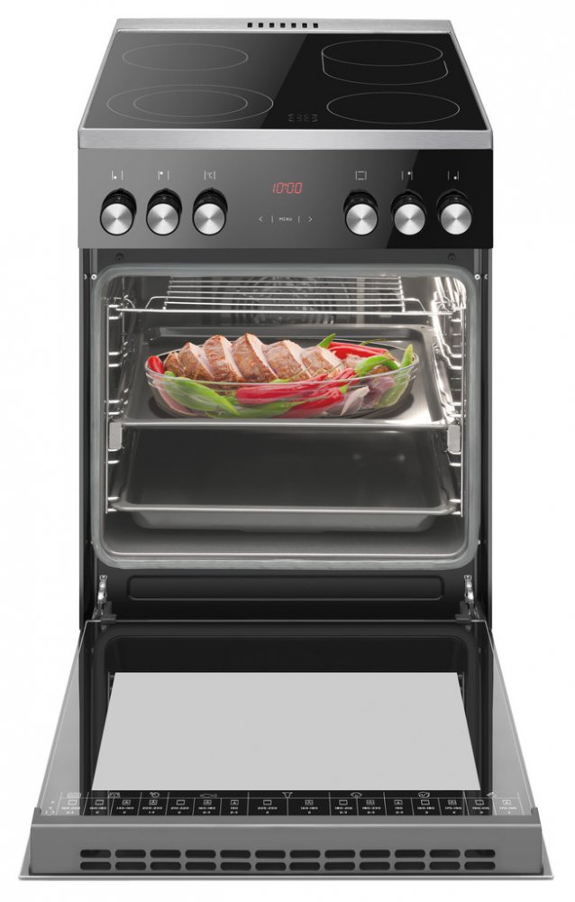 sporák se sklokeramickou deskou • energetická třída A • objem 65 l • teleskopický výsuv • dotykový displej • 4 varné zóny • oválná a duální zóna • mechanické ovládání • 11 programů • gril • horkovzduch • zavírání dvířek soft close • trojité sklo • 2× plech • rozměry: 52,5 × 97,0 × 68,0 cm • hmotnost: 38,5 kg