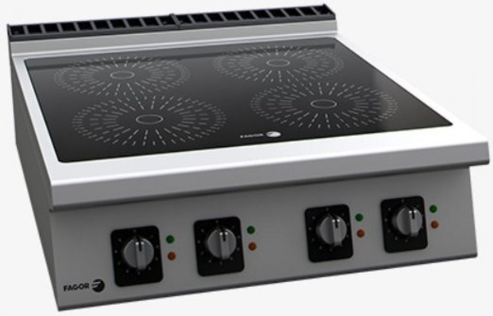 Indukční sporák Fagor o rozměru 800x730x290 mm. 4x plotýnka o Ø300 mm, výkon 4x5 kW. Vynikající ovládání vaření regulátorem energie s 10 stupni výkonu. Provedení bez podestavby.