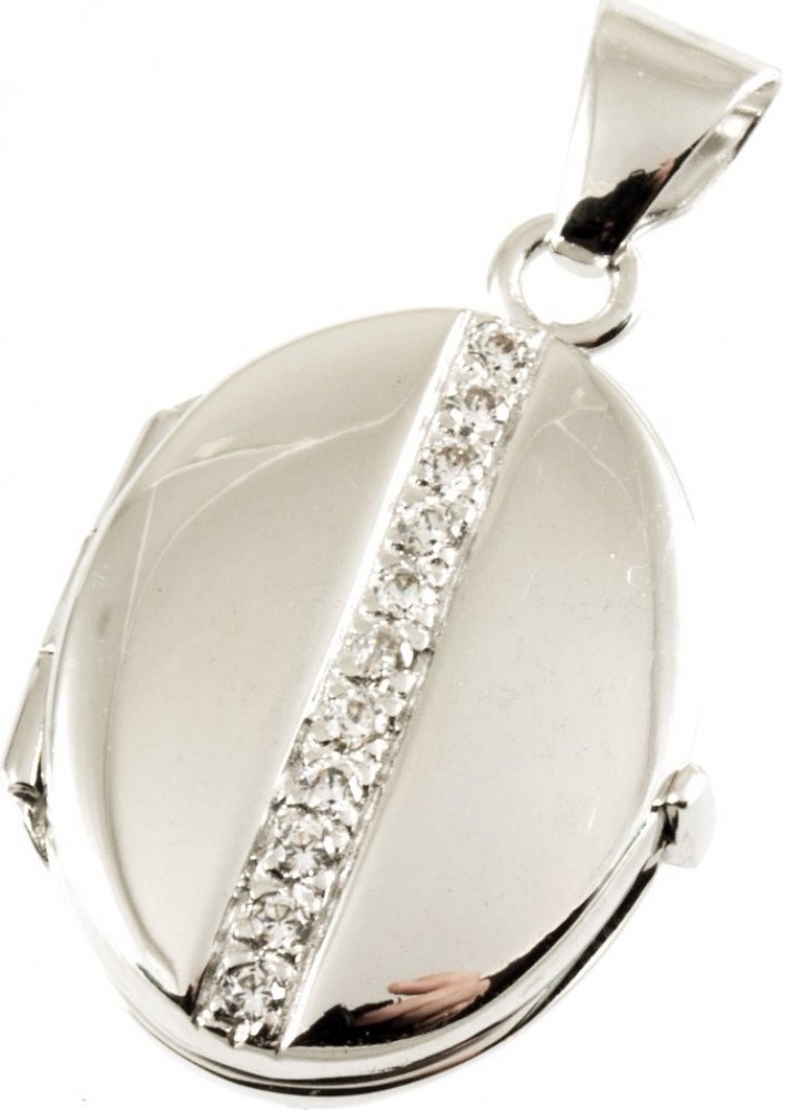 Zlatý oválný medailonek zdobený čirými zirkony v bílém 14ti karátovém zlatě ryzosti 585/1000 o rozměru 17x20mm a hmotnosti 5.70g. celková délka 3cm.