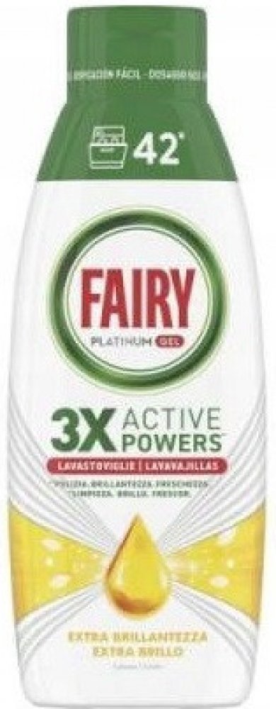 Fairy gel do myčky Platinum vše v jednom je vysoce účinný tekutý prostředek z řady Platinum na mytí nádobí od značky Fairy. Působí proti připáleninám, mastnotě, odolným skvrnám a nečistotám a je 3x účinnější než dříve. Rychle se rozpouští. Nezanechává žádné zbytky a přináší zářivě čistý lesk beze šmouh po každém mycím cyklu. Lze použít na všechny materiály vhodné do myčky. Složení 3x účinější proti mastnotě obsahuje aktivní odmašťovače pro čisté a lesklé nádobí. Funkce gelu do myčky: chrání dekor vašeho nádobí, přináší zářivý lesk, žádné zbytky, účinný již od nízkých teplot, funkce předmývání, účinně proti připáleninám a mastnotě.