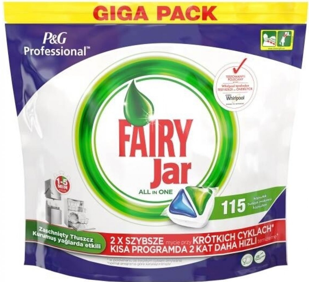 Kapsle do myček nádobí Jar Professional All in One pomáhají odstranit i zaschlou mastnotu. Jsou vhodné i pro použití v profesionálních myčkách nádobí s krátkým cyklem mytí (1-5 min). Rozpouštějí se 2x rychleji než běžné pevné tablety. Povrchově aktivní látky zajistí dokonalé odstranění zbytků jídel a mastnoty z nádobí a jejich uzamčení ve vodě, což zabraňuje jejich opětovnému usazování na příborec...