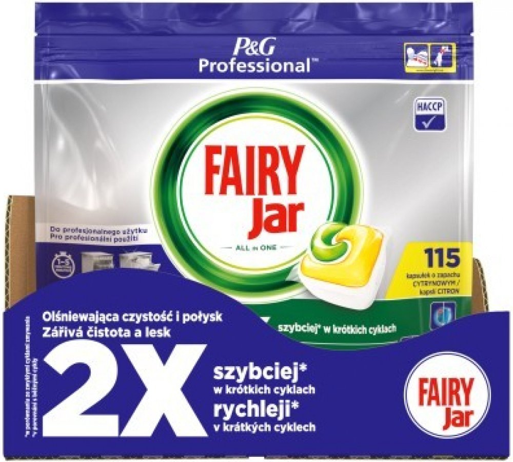 Tablety do myček nádobí Jar Professional All in One pomáhají odstranit i zaschlou mastnotu. Jsou vhodné i pro použití v profesionálních myčkách nádobí s krátkým cyklem mytí (1-5 min). Rozpouštějí se 2x rychleji než běžné pevné tablety. Povrchově aktivní látky zajistí dokonalé odstranění zbytků jídel a mastnoty z nádobí a jejich uzamčení ve vodě, což zabraňuje jejich opětovnému usazování na příborech, talířích a skle. Vhodné i pro myčky skla. Účinné při všech stupních tvrdosti vody.