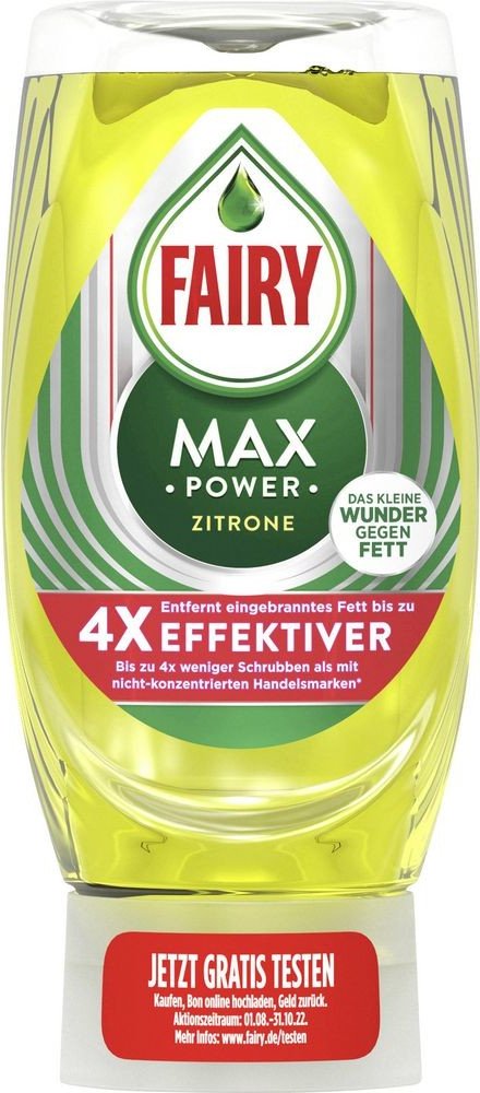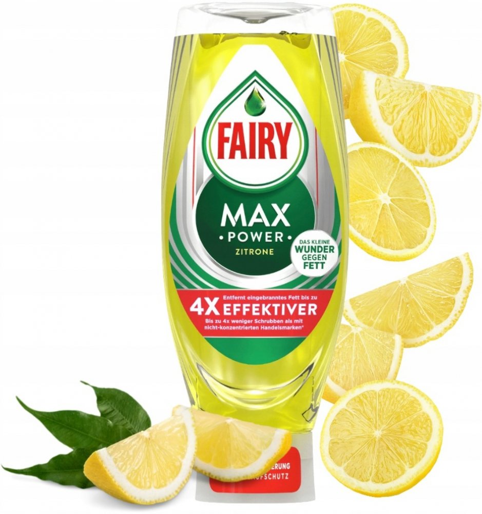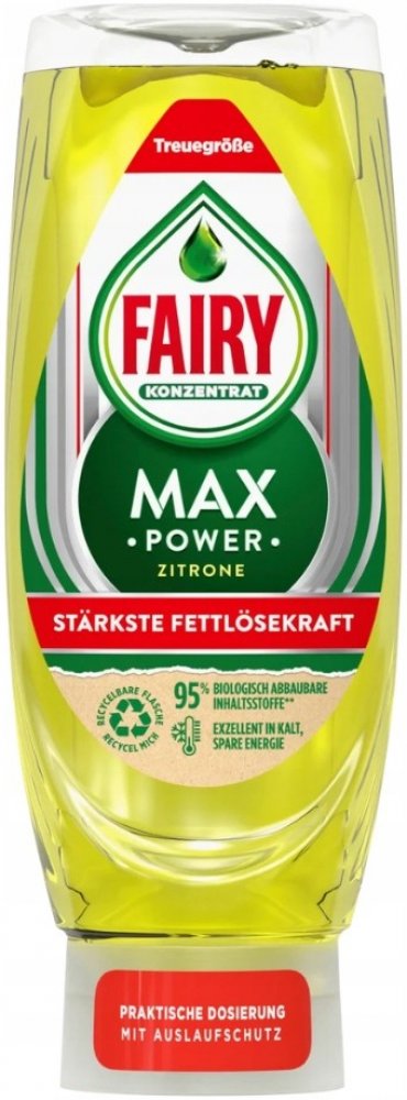 Díky Fairy Max Power je mytí ještě jednodušší – díky praktické láhvi stojící na hlavě – zajišťuje rychlé a snadné dávkování. Nástavec je vybaven ochranou proti úniku, která umožňuje vytlačování potřebného množství do poslední kapky – pro menší množství nečistot a menší množství odpadu. Fairy bez problémů odstraňuje odolnou mastnotu a nečistoty. Díky vysoce koncentrovanému složení musíte méně drhnout a už jedna kapka zajistí, že vaše nádobí bude bezchybně čisté