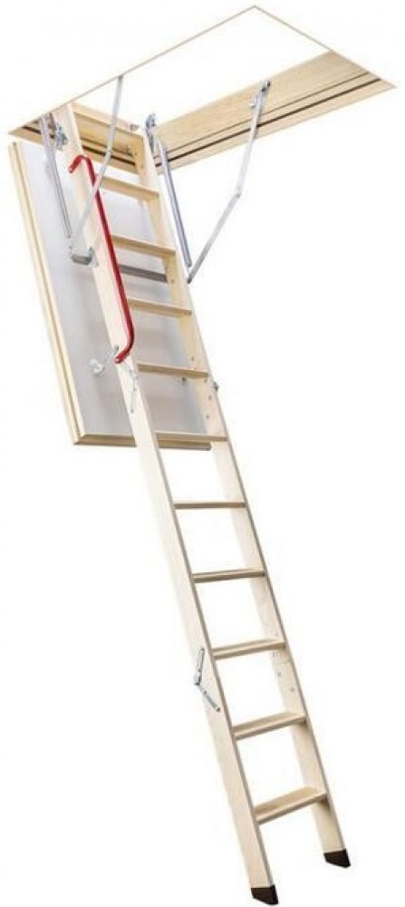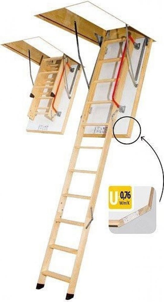 Zateplené super thermoizolační třídílné půdní schody LTK Energy jsou vyrobeny z kvalitního borovicového dřeva. Oproti schodům LWK Komfort se liší výškou rámu, která činí 22 cm a tloušťkou termoizolačního poklopu 6,6 cm. Půdní schody FAKRO LTK představují výtečnou tepelnou bariéru a minimalizují tepelné ztráty v interiéru. Kovové madlo červené barvy je uchyceno k úhelníkům žebříku a tvoří bezpečnostní prvek při výstupu do podkroví. Patky jsou montovány ve spodní části bočnic, přispívají k celkové estetice produktu, zvyšují stabilitu a chrání povrch podlahy. Zámek a ovládací tyč součástí každého balení. Použití půdních schodů FAKRO LTK