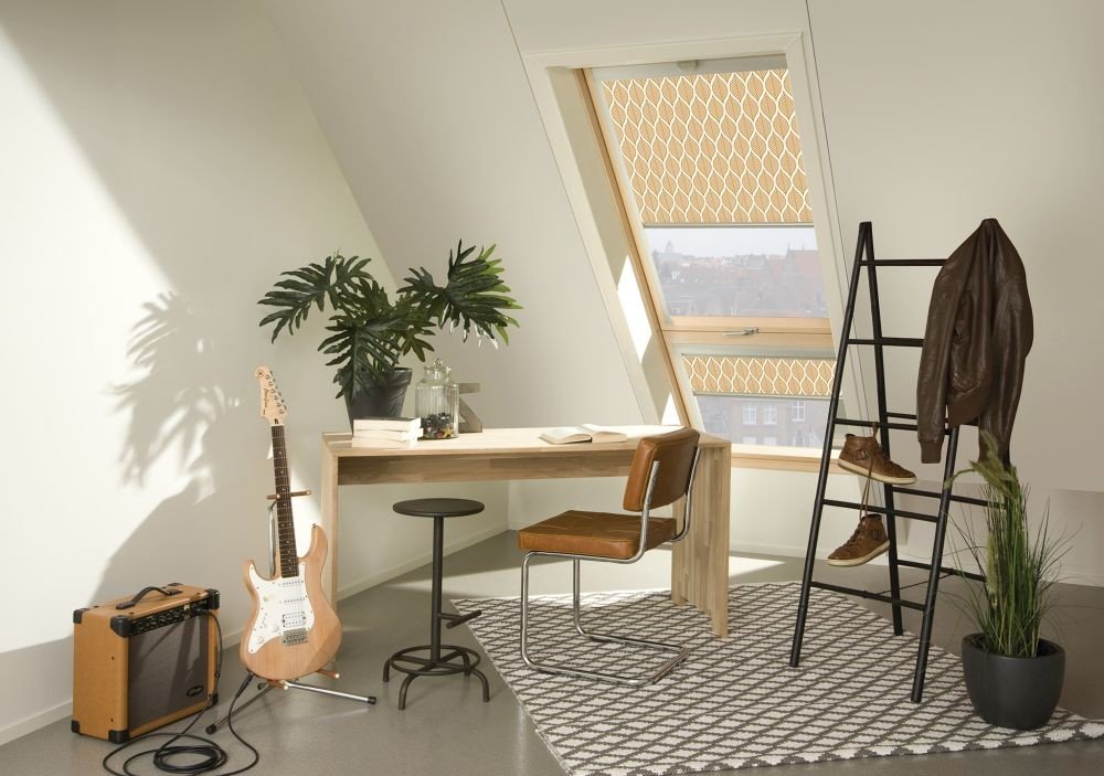 Fakro roleta ARF F v barevných motivech dle výběru vyrobena z elegantního, dekorativního materiálu, který nepropouští světlo. Boční vodicí lišty umožňují nastavení rolety v libovolné poloze.