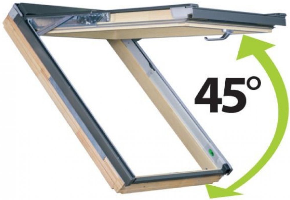 Střešní okno Fakro FPP-V s energetickým zasklením U3 - dvojsklo vybaveno dvěma oddělenými funkcemi otevírání – výklopnou a kyvnou za pomoci přepínače preSelect. Klika Elegant umístěna ve spodní části okna přináší pohodlnou obsluhu. Dřevěné střešní okno FPP-V vybaveno ventilační klapkou V 40P.