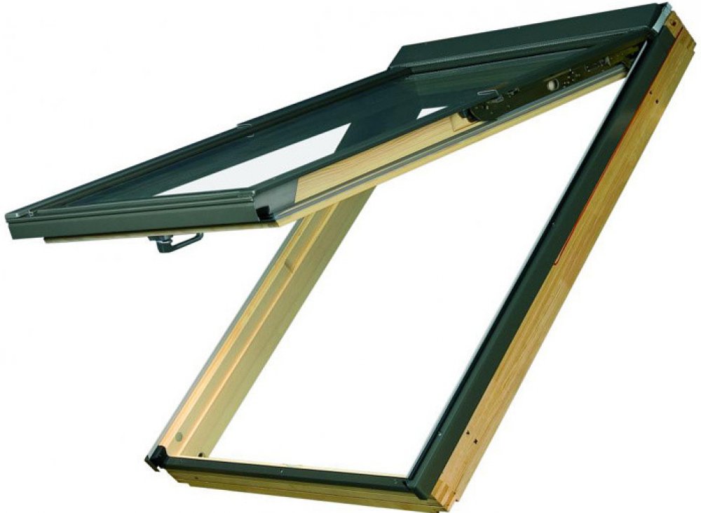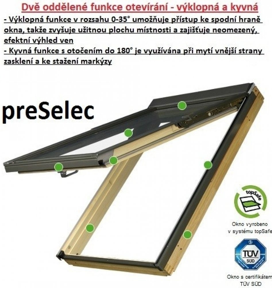 Tento model dřevěného střešního okna zasklený izolačními trojskly U=0,5 shrnuje dva konstrukční typy do jednoho. Donedávna se zákazníci při výběru jaké střešní okna použijí rozhodnout, zda zvolí konstrukční typ kyvných střešních oken, která mají panty ve středu a přetáčejí se a nebo se rozhodnout pro výklopné provedení. Nevýhodnou výklopného provedení byla skutečnost, že nebylo možné přetočení okenního křídla pro mytí venkovní strany okna. Mytí tak bylo velice obtížné a proto model výklopných oken nezískal velkou oblibu. Moderní výklopní střešní okna však nabízejí unikátní systém, který spojuje oba konstrukční typy oken do jednoho a spojuje jejich výhody v jednom provedení. Pokud využíváte zrovna funkci výklopnou, díky které si užíváte nerušeného výhledu do okolí a lepšího přístupu k oknu a rozhodnete se oknu umýt, postačí jednoduše jedním prstem posunout tlačítko (funkce PRESELECT) a okno běžným způsobem zavřít. Jakmile okno otevřete, je již aktivována funkce kyvná a okno se rázem přetáčí na středovém závěsu. To umožní jeho přetočení a velmi snadné umytí pohodlně z místnosti.