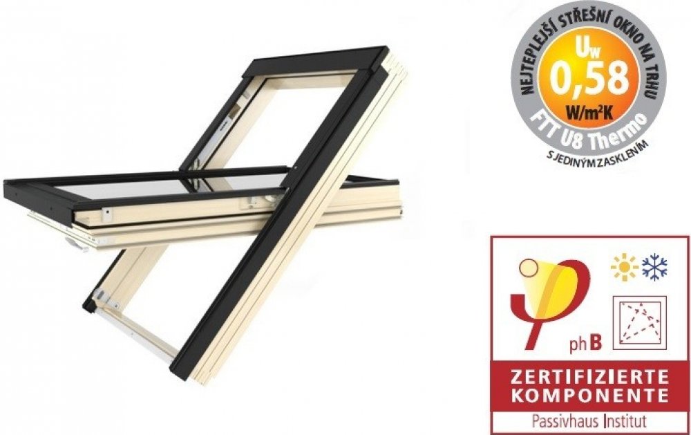 Speciální střešní okna FTT U8 THERMO určená pro nízkoenergetické a pasivní stavby. Zasklení je osazeno ve speciálně vyprojektovaném rámu křídla, který je konstruován ze širších dřevěných profilů ve srovnání se standardním oknem. Tato konstrukce minimalizuje vznik tepelných mostů a zajišťuje celkově lepší izolační vlastnosti okna. Okna jsou vybavena pětinásobným systémem těsnění. Kyvná okna se závěsy umístěnými nad polovinou výšky okna zajišťují pohodlný přístup k otevřenému oknu i vysokým osobám. Pohodlná obsluha okna s využitím kliky umístěné v dolní části křídla. Klika s funkcí dvoubodového uzavírání. Snadné mytí vnější okenní tabule a stažení markýzy umožňuje pojistka, blokující křídlo v poloze pootočené o 180°. Zvýšená odolnost proti vloupání – systém topSafe. Široká paleta vnitřních i vnějších doplňků. Pasivní zasklení U8, čtyřsklo!. Charakteristika: - Uw=0,58 W/m2K - nejteplejší střešní okno s jediným zasklením dostupné na trhu! - thermo rámeček, - Dodává se společně s lemováním EHV-AT Thermo (součást balení)!!! - ve standardu vybaveno izolační sadou XDK, která obsahuje zateplovací sadu XDP a parotěsný límec XDS, - technologie thermoPro zvyšuje životnost a parametry střešních oken, - borovicové dřevo nejvyšší kvality, vrstevně klížené, vakuově impregnované, - lakováno dvěma vrstvami transparentního ekologicky nezávadného akrylátového laku, - určeno pro pasivní stavby, potvrzeno certifikátem Passive House, - montováno spolu s těsnícím lemováním do střech se sklonem od 15° do 70°.