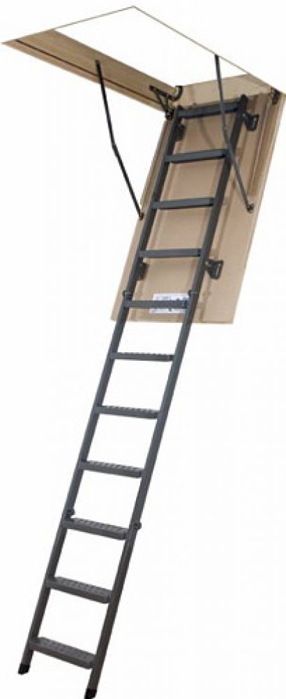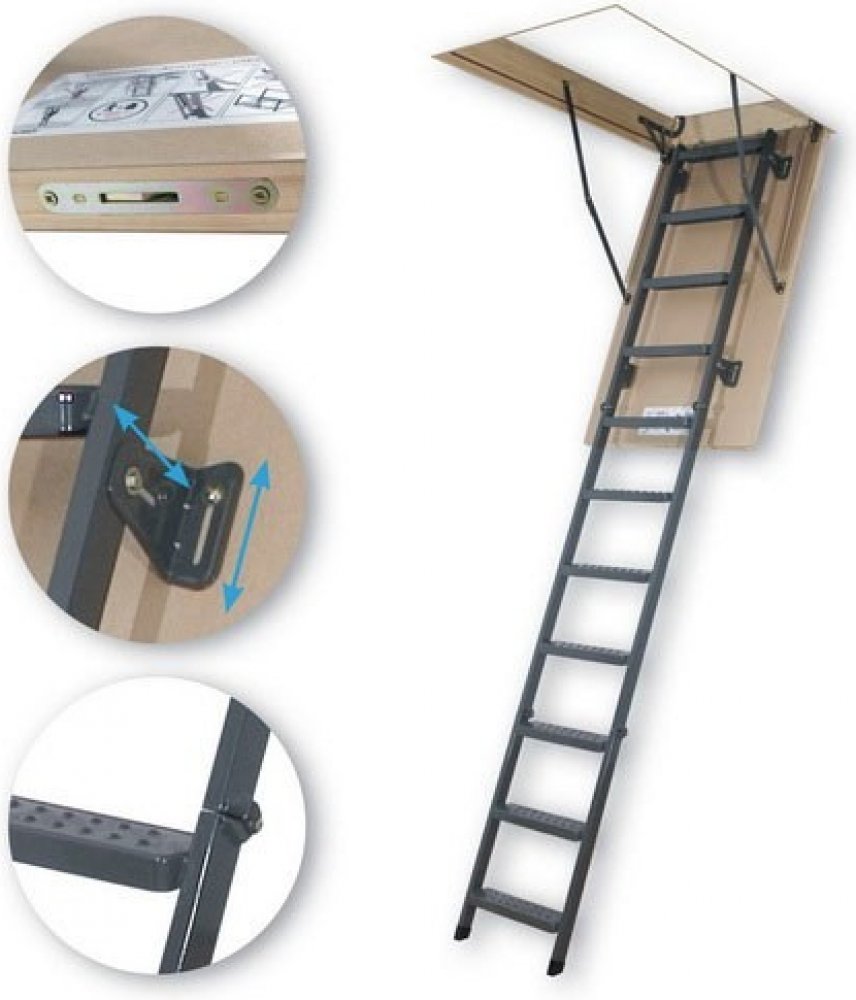Skládací půdní schody z kovovým schodištěm. Skládací způsob rozkládaní schodiště a blokáda poklopu v poloze plného otevření zaručují snadnou obsluhu.