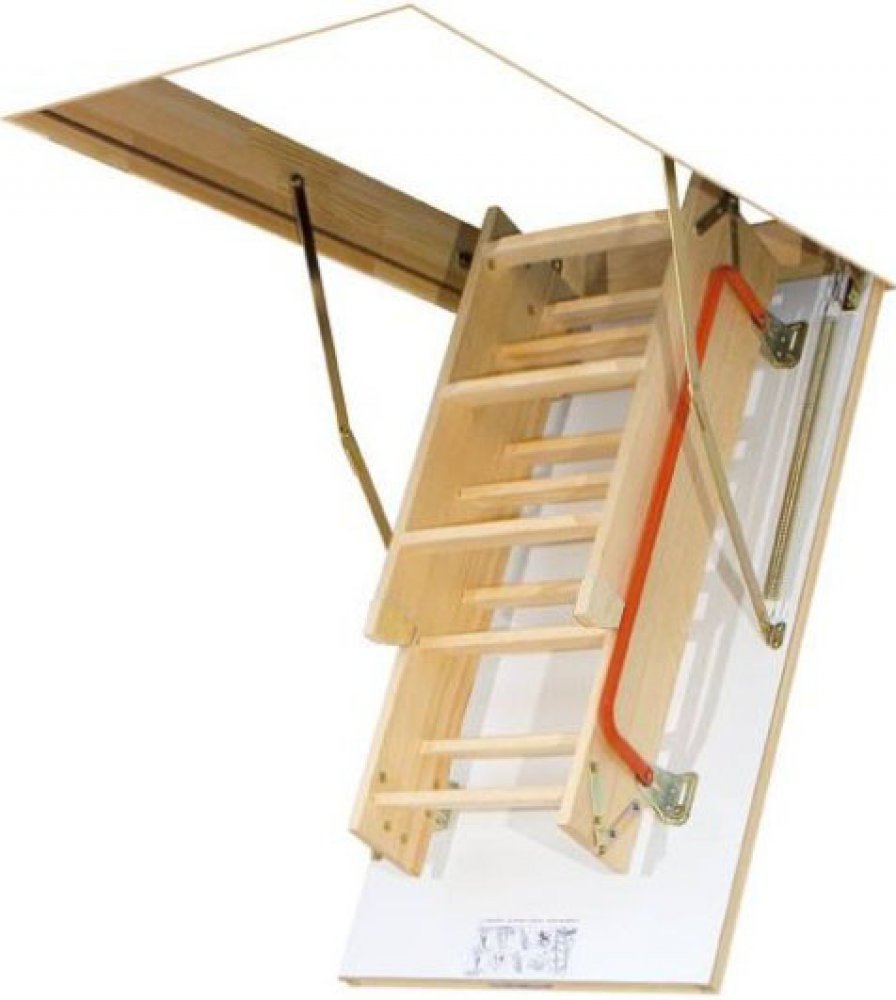 Půdní schody FAKRO typu LWK KOMFORT jsou dřevěné třídílné schody vyrobené z kvalitního borovicového dřeva se zatepleným poklopem z přírodní dřevotřísky polepené oboustranně deskou HDF v bílé barvě, vybavené dodatečným bezpečnostním kovovým mádlem a umělohmotnými ochrannými patkami.Meziprostor je vyplněn 30 mm vrstvou polystyrenu. Poklop je zajištěn speciálním zámkem. Příslušenstvím je kovová tyč sloužící pro snadnou manipulaci s poklopem a ovládání zámku.